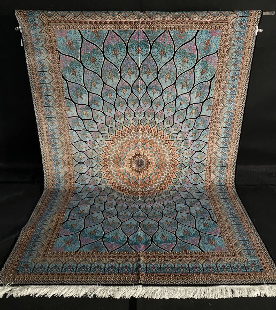 この絨毯の柄は、**「シャー(太陽)モチーフ」や「ペルシャのモスク天井文様(メダリオン・ロータスデザイン)」**と呼ばれる、伝統的なペルシャ絨毯の代表的なデザインの一つです。以下に詳しく説明します。