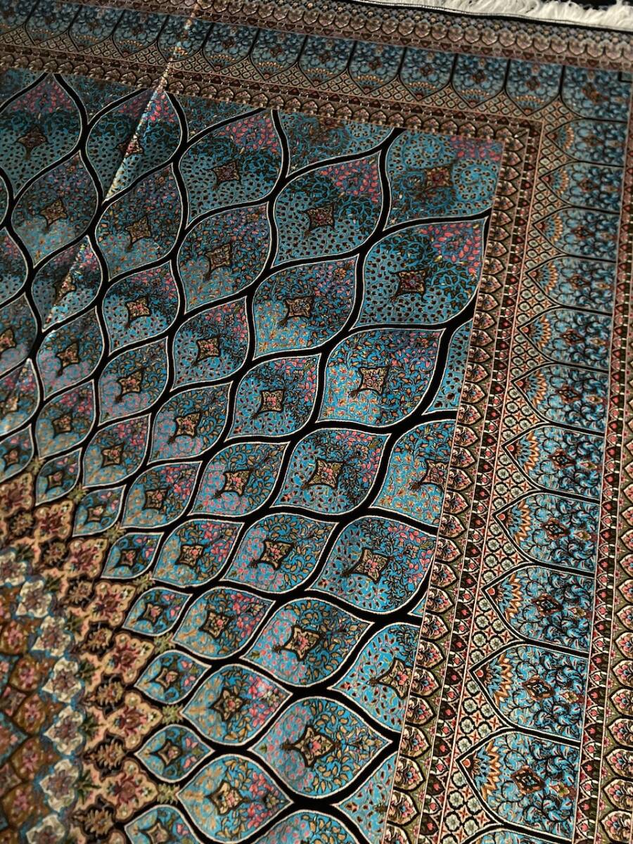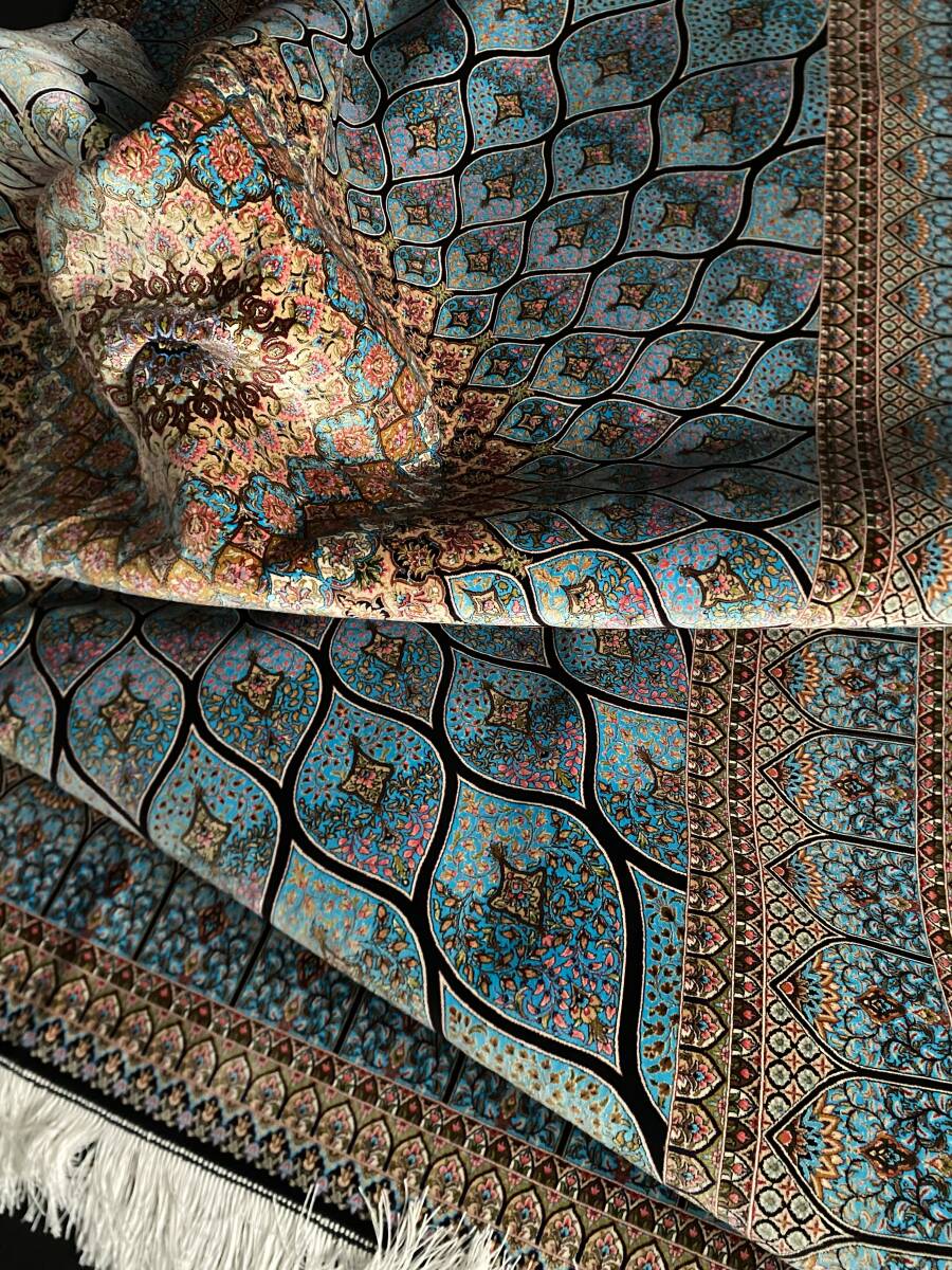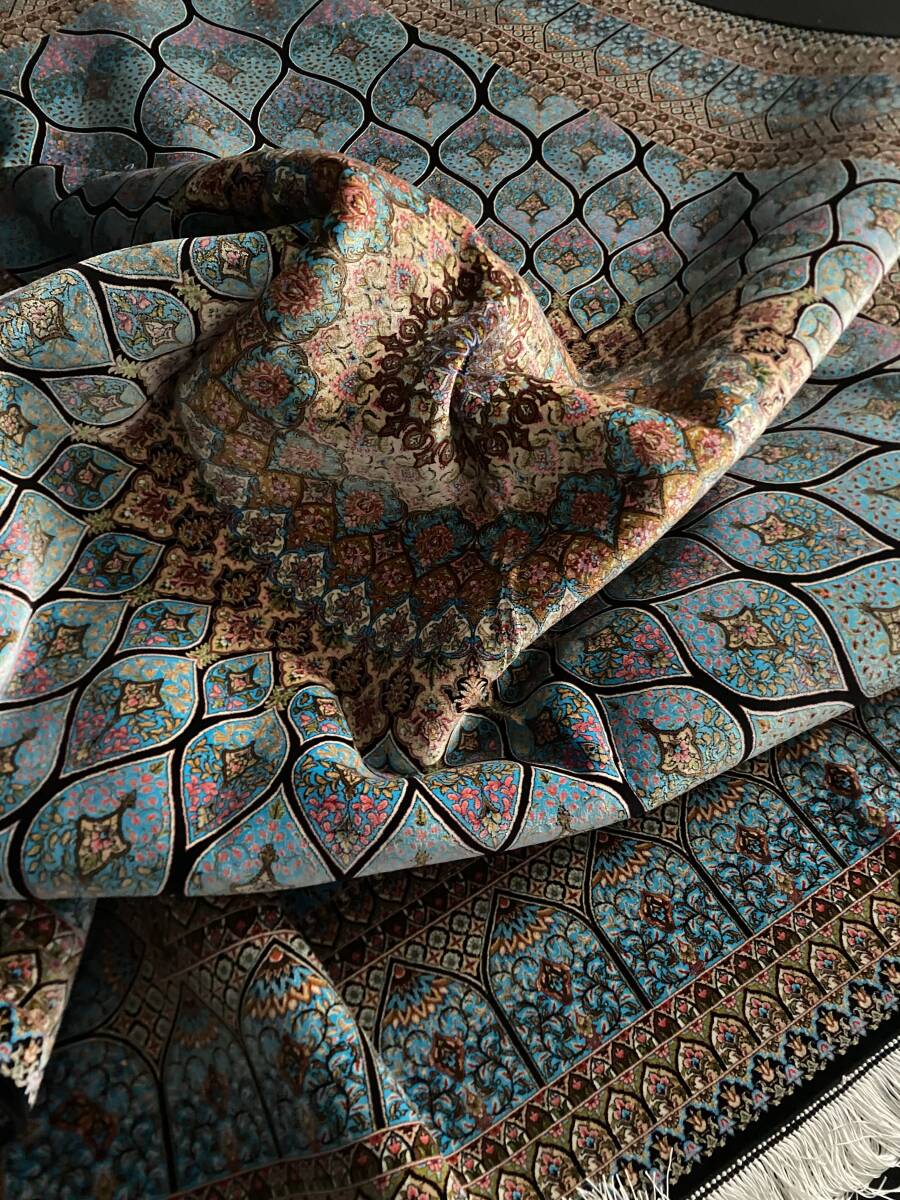 クム絨毯の歴史は1930年頃からと浅く、最初はウール絨毯を、後にシルク絨毯を織るようになりました。絹の産地としても有名なクムで、現在作られるほとんどの絨毯は100%シルク製です。