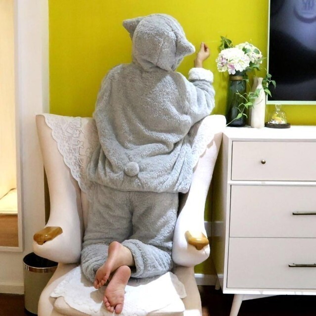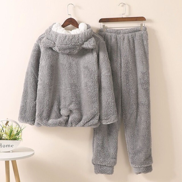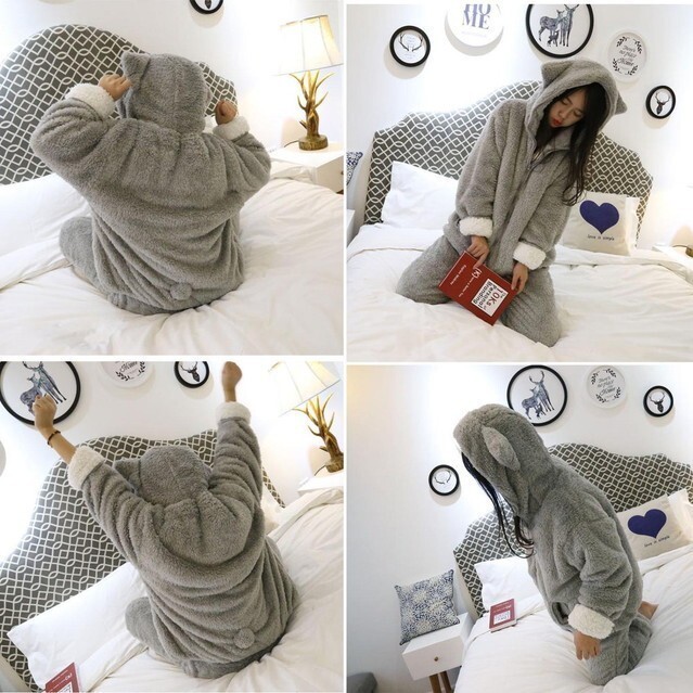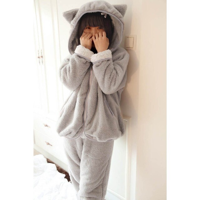パジャマ 冬 耳付きフード もこもこ 長袖 前開き しっぽ 付き 上下セット 超暖か レディース グレー XL