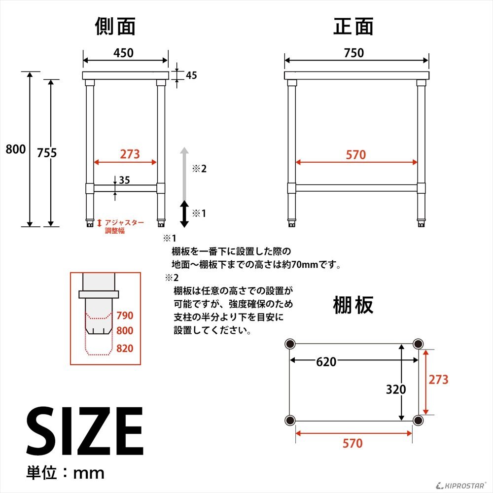 | 材質 | 天板:ステンレスSUS430 脚:ステンレスSUS201 梁:スチール アジャスト脚:ステンレスSUS201/PVC |
