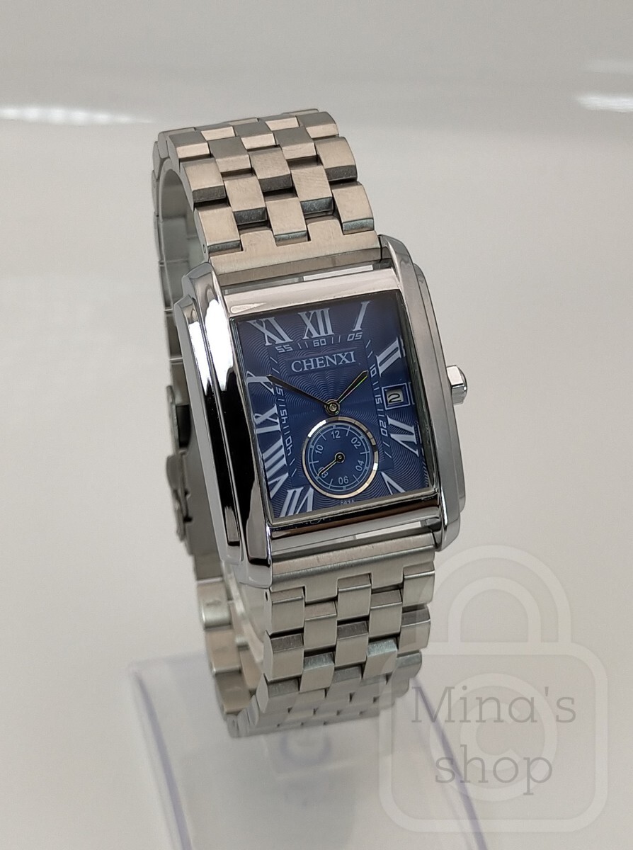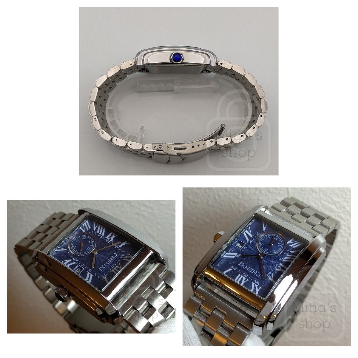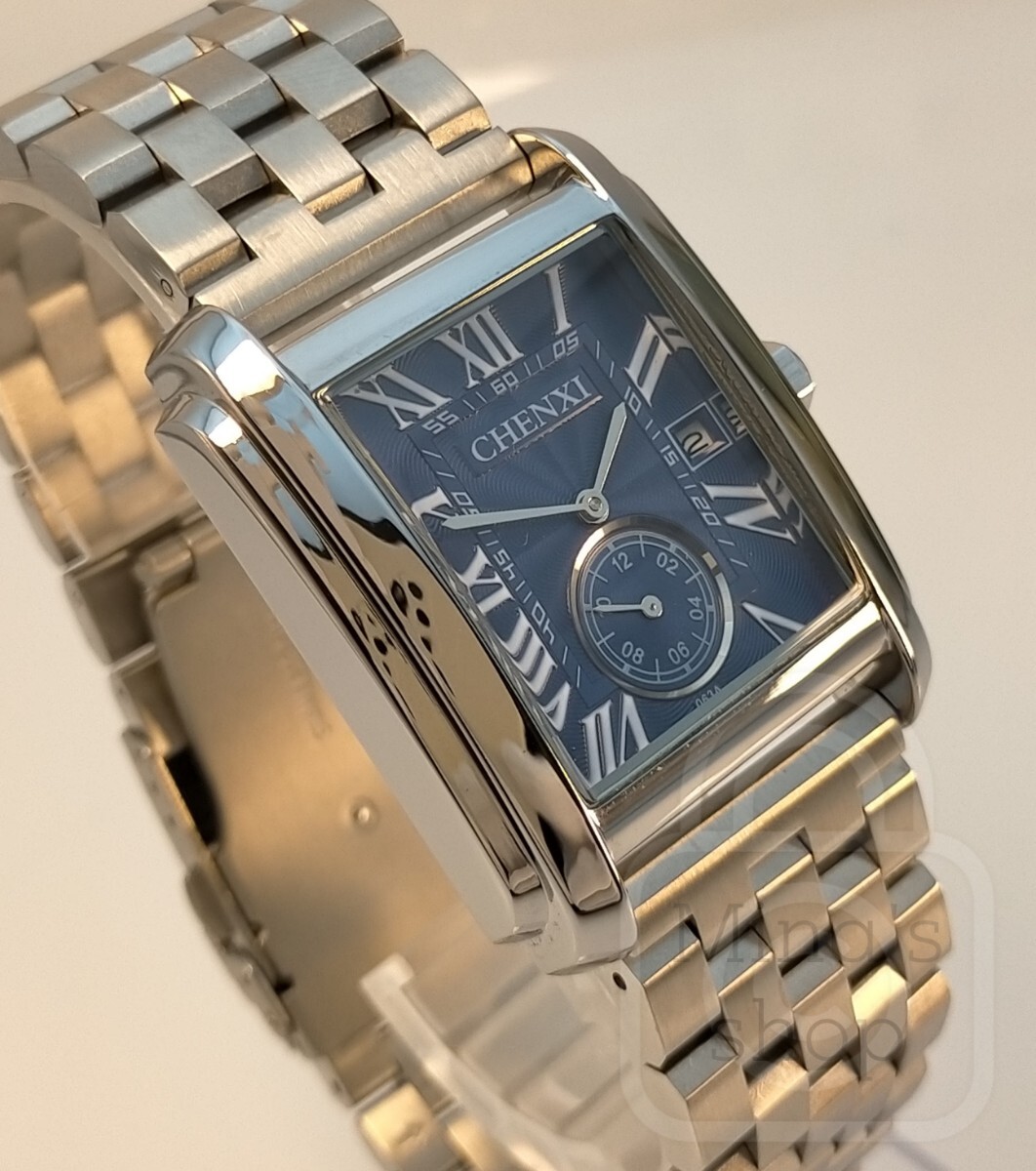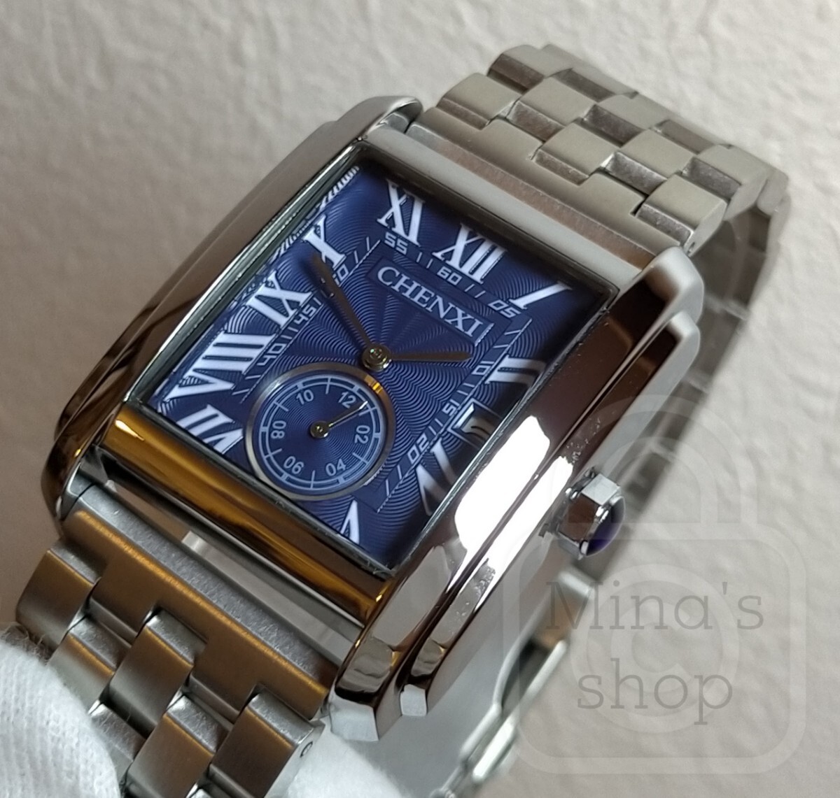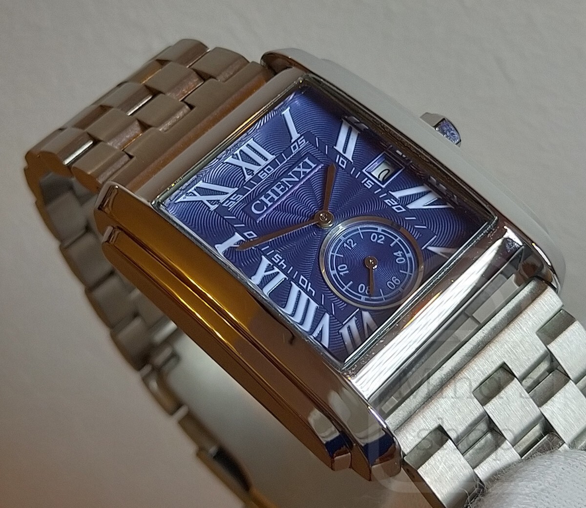 レクタングル、つまり長方形のケースならではの力強さが極太かつ多段階フレーム、そして肉厚の角5連ステンレスブレスも相まり力強さが際立っていますが、同時に文字盤のサファイアブルーに加え巧みにアールラインを取り入れることで不思議と威圧感のない品位すら漂っています。