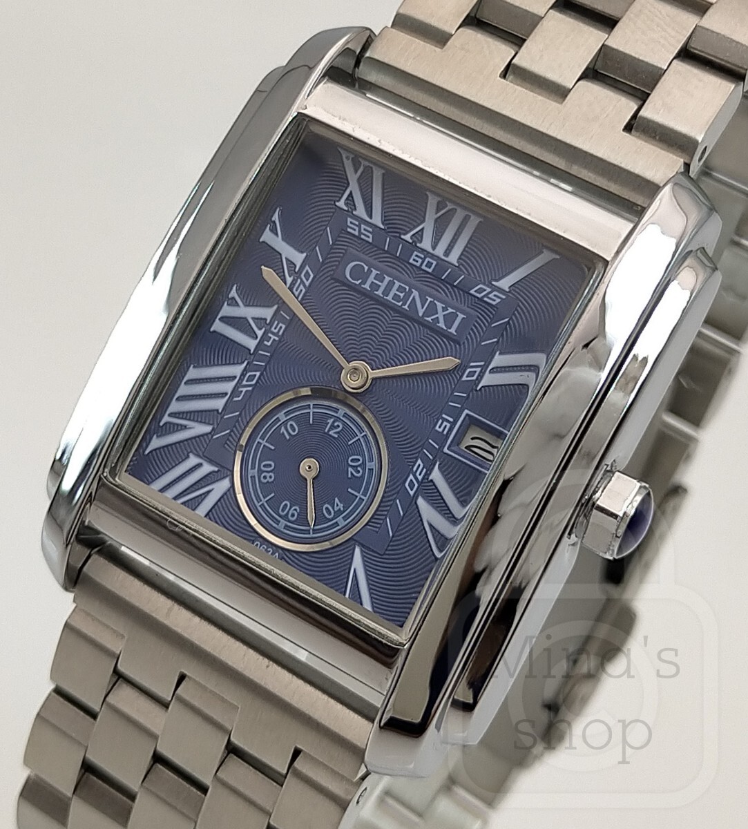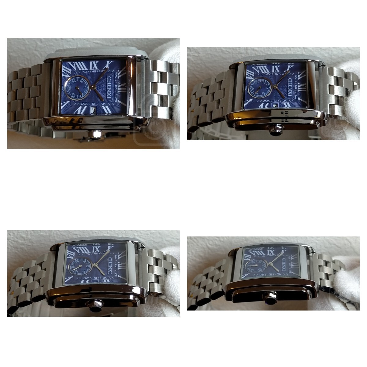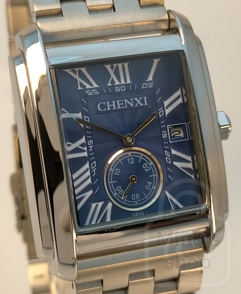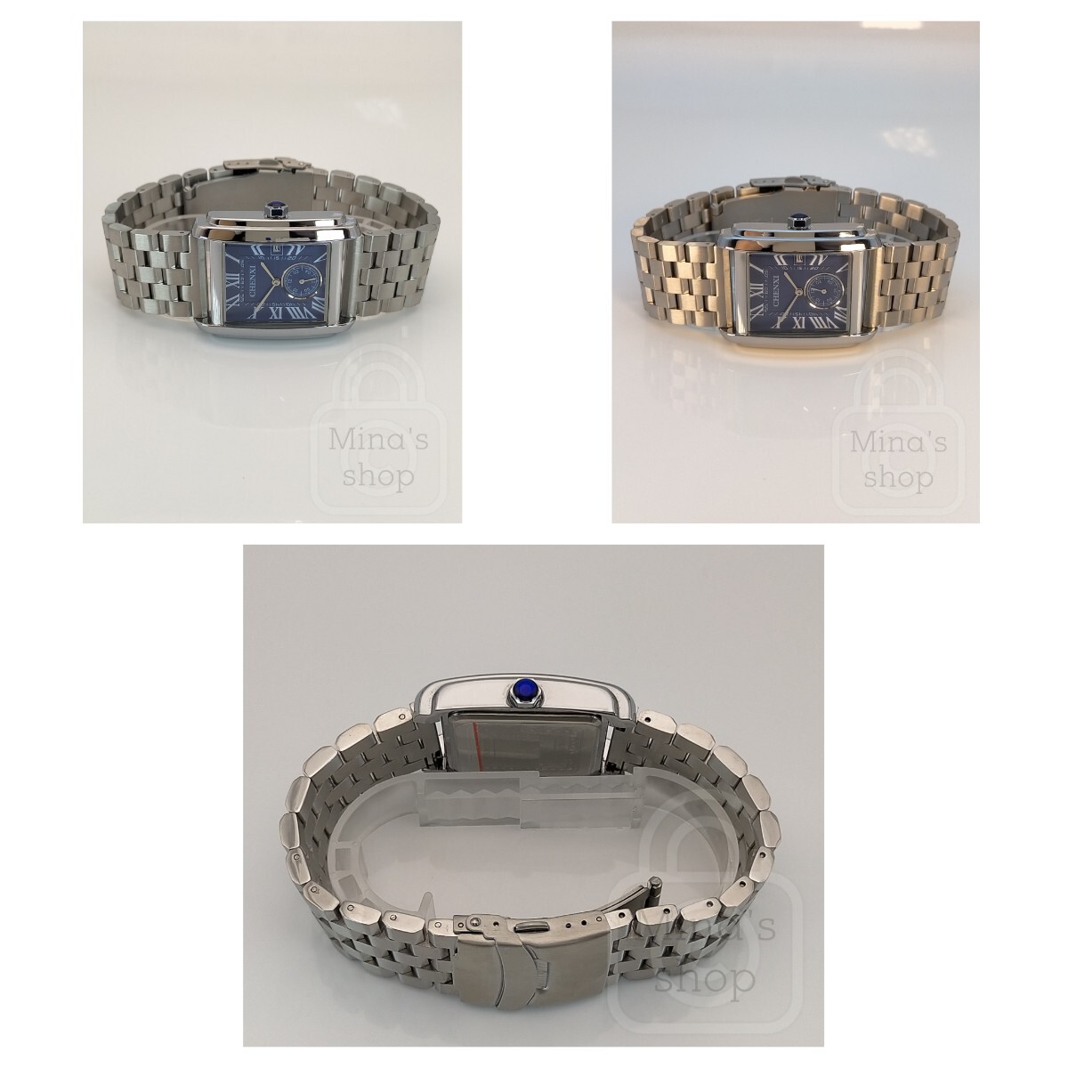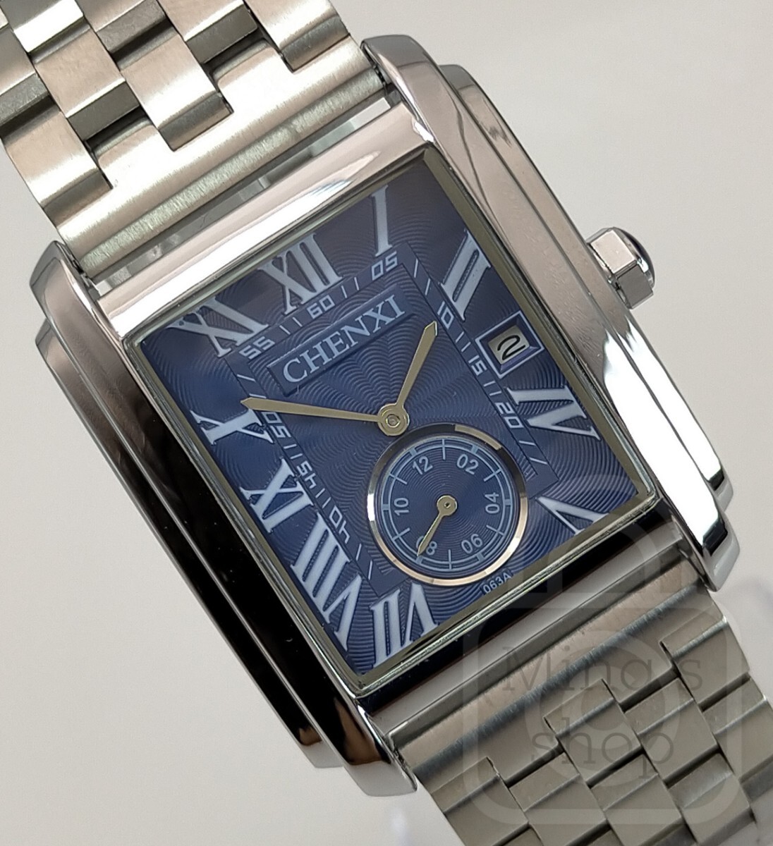 レクタングル、つまり長方形のケースならではの力強さが極太かつ多段階フレーム、そして肉厚の角5連ステンレスブレスも相まり力強さが際立っていますが、同時に文字盤のサファイアブルーに加え巧みにアールラインを取り入れることで不思議と威圧感のない品位すら漂っています。