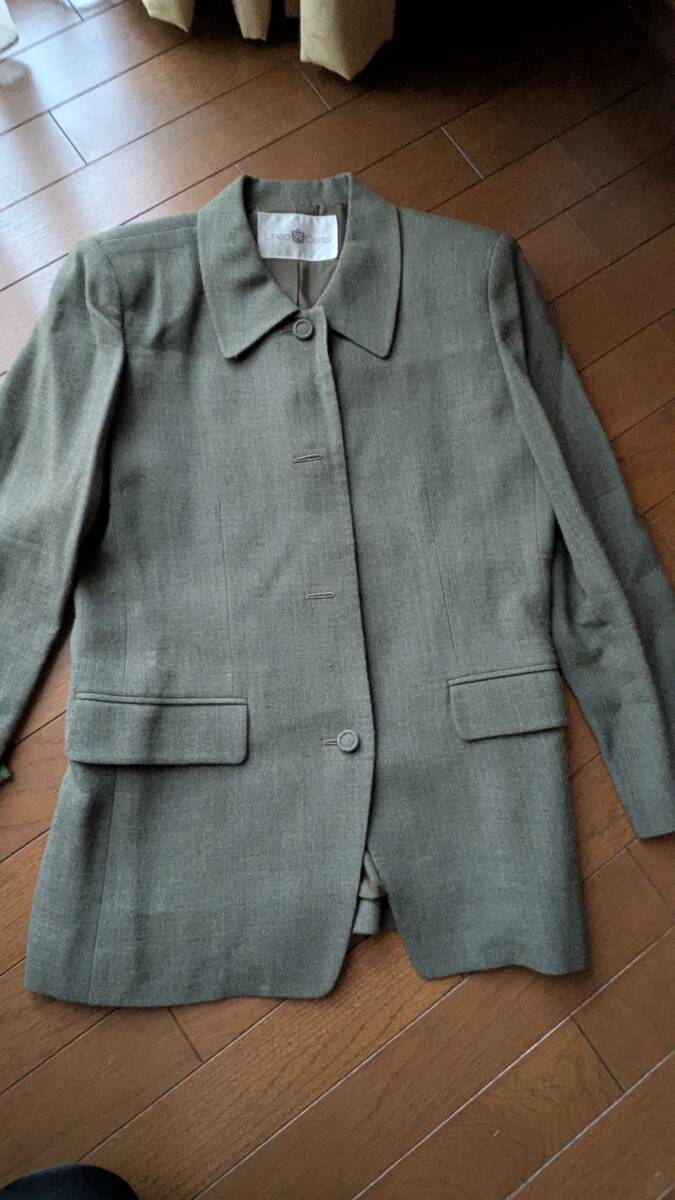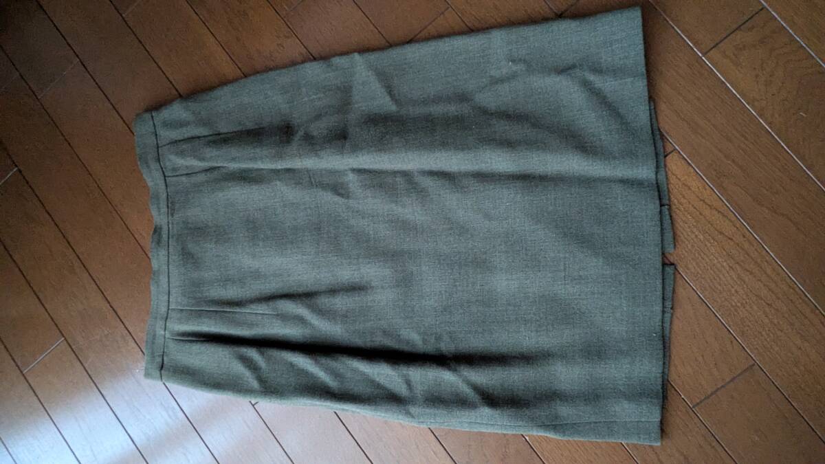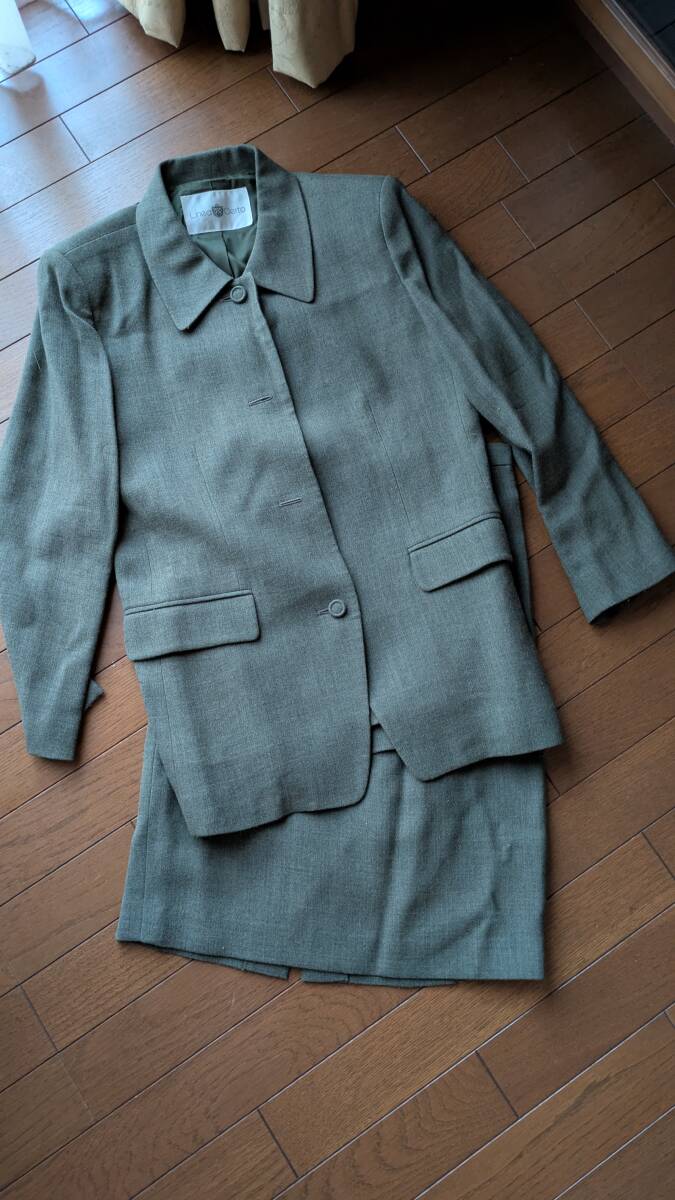 オリーブ系のセットアップのひざ丈スーツ38になります。