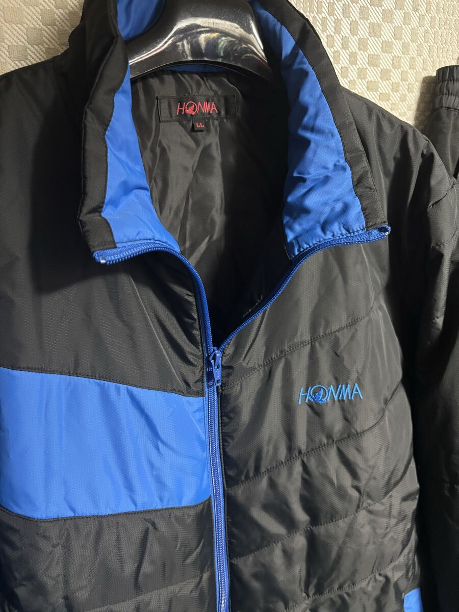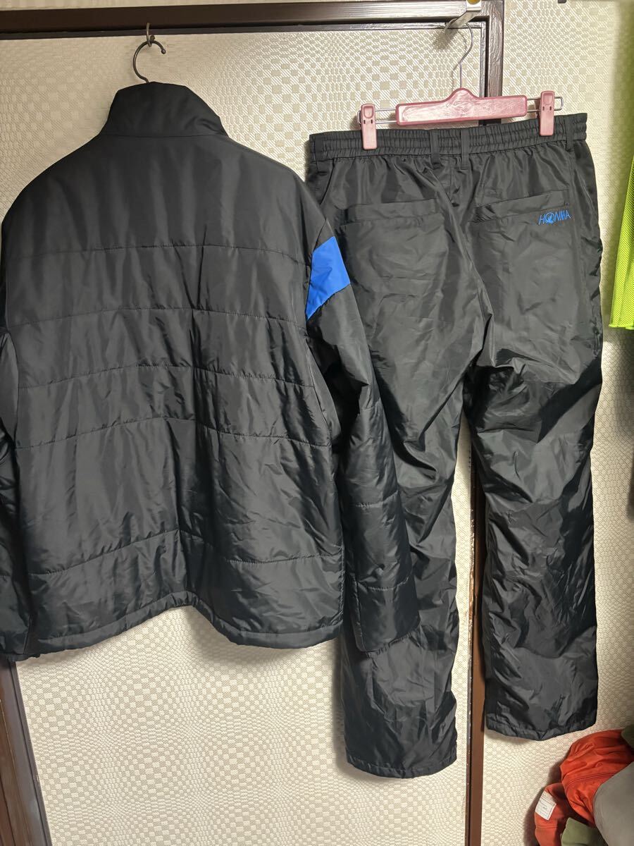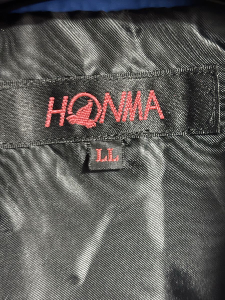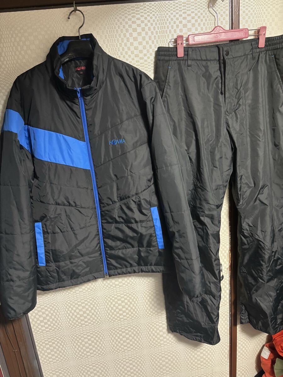 ホンマゴルフの中綿入りウインターセットアップです。サイズ L L表記で平置き脇下身幅63、着丈72、肩幅50袖丈67ウェストゴム42〜49股下78裾幅23全長107センチ位です。綺麗な状態ですよ。