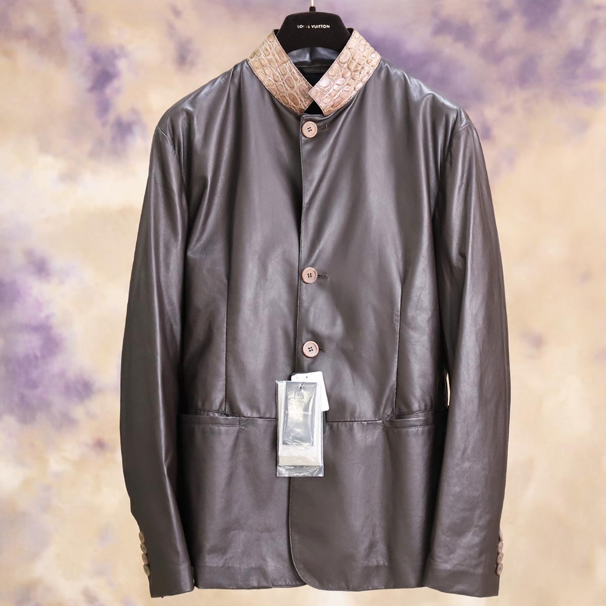 ジョルジオ・アルマーニのクロコダイルレザーラペル テーラードラムレザージャケットです。 極上の素材感を誇る最高級ラムレザーをベースに襟元をマットクロコダイルレザーで仕上げたハイエンドエキゾチックアウターコレクション。 シンプルな2WAYテーラードスタイルながら裏地は皺加工を加えた極希少な一着です。 市場でもジョルジオ・アルマーニのメンズレザーアウターは圧倒的な人気を誇るのでお探しの方も非常に多いかと思います。 |