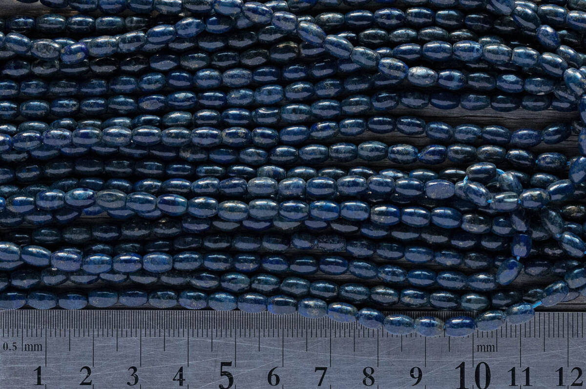 ライスタイプのラピスです。 ブレス・アンクやネックレスに是非どうぞ! とても雰囲気の良い石です。 写真はサンプルとさせていただきます。 粒のサイズ、若干の個体差があります。 稀にクラックがある粒がありますが、 状態は概ね良好です。 全長:約40cm(ビーズ部分のみ) サイズ:写真を参考にしてください。 average 6mm x 4mm ※5%前後の+-誤差はご了承くださいませ。 ※サイズにばらつきがありますので 細かくサイズにこだわる方はご購入をお控えください。