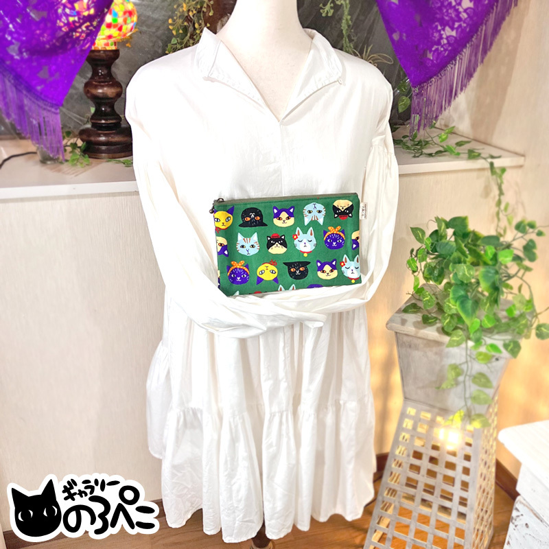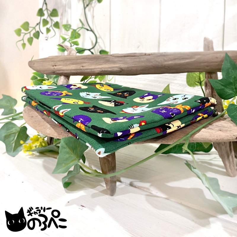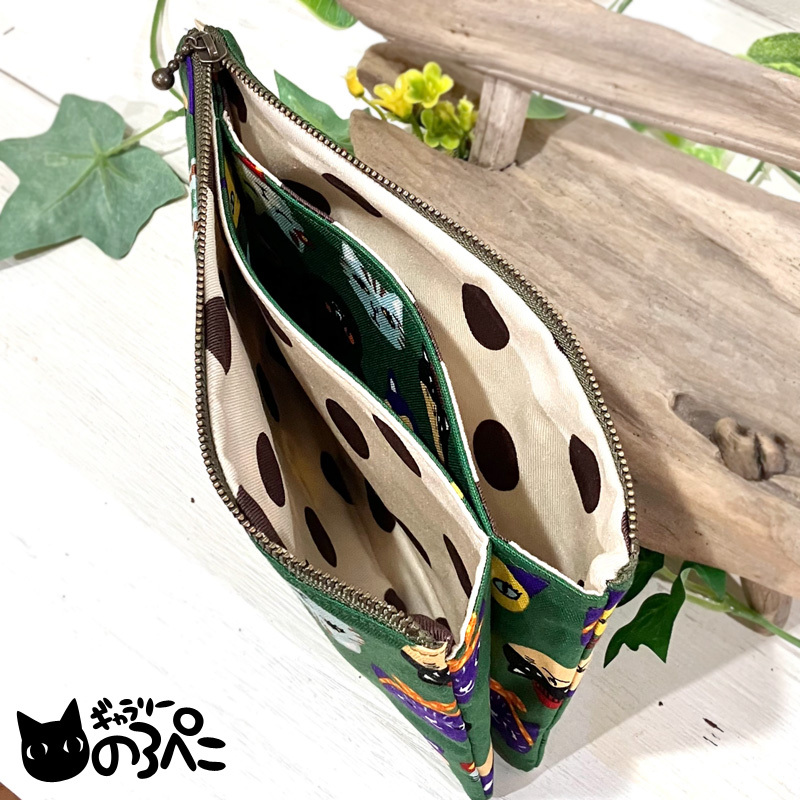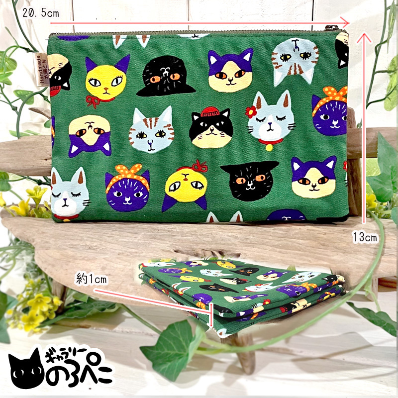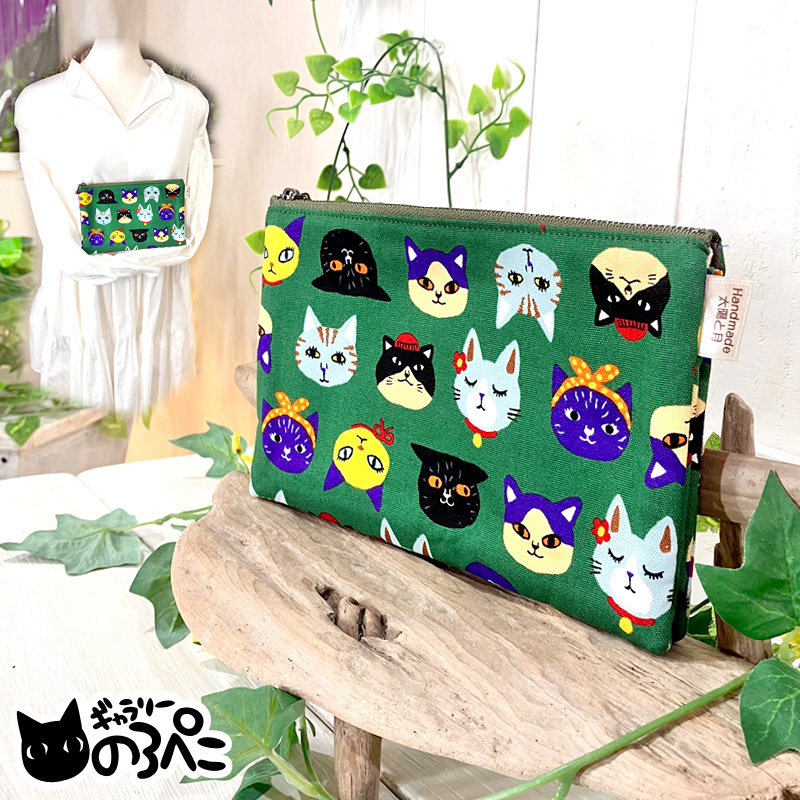 猫ちゃんのお顔が並んだ仕切り付きマルチポーチ(猫柄コットンの仕切り付きマルチポーチ・グリーン) bc862-22