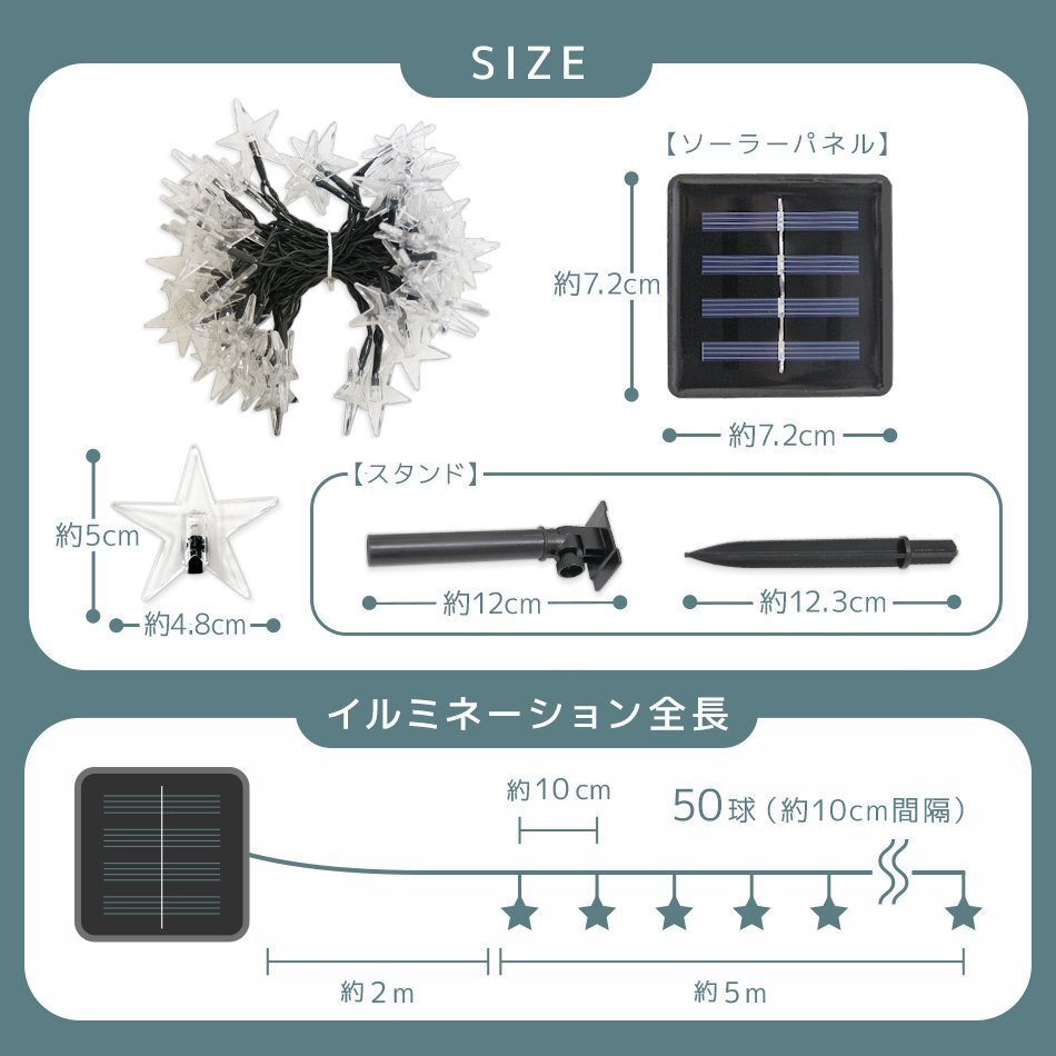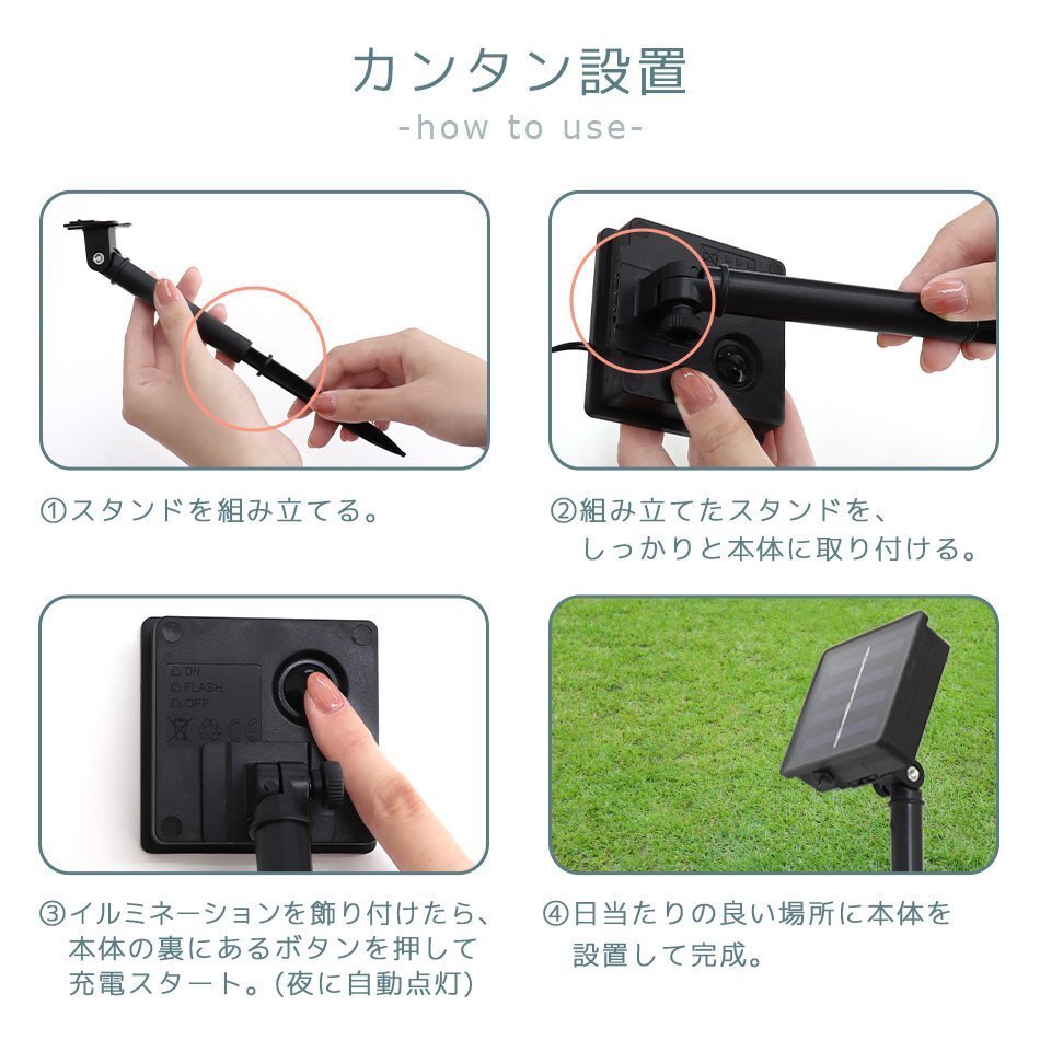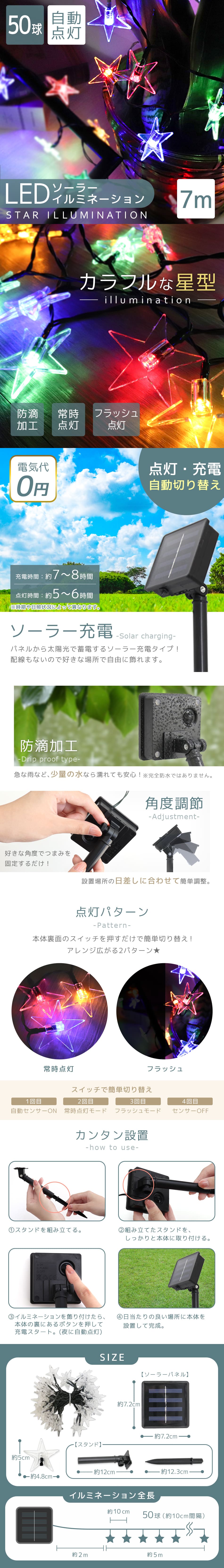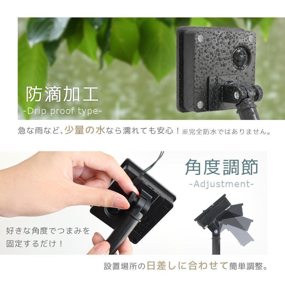 | ソーラーパネルで充電するので、電源不要で電気代0円! 経済的でエコなイルミネーションです。 暗くなると自動で点灯、明るくなると自動で消灯する明るさセンサー付きなのでとても便利! 使用しない場合は電源をOFFにしておけば暗くなっても光りません。 電源をコンセントから取らなくていいので、日の当たるソーラーパネルを置くスペースさえあればどこでも楽しむことが出来ます。 お庭の植え込みに、ラティスやベランダに! クリスマスイルミネーションにピッタリ!ハロウィンもピッタリです♪ 【商品仕様】 種類:スタータイプ サイズ(約): ・ソーラー本体:7.2×7.2×2.3cm ・支柱:21.5cm 重量(約):270g LED数:50球 点灯パターン:2パターン(常時点灯、点滅) 5時間充電で、6時間程度使用可能 ※時間は目安で、使用環境により異なります。 ※環境により充電時間は伸びます。 カラー:ミックスカラー(ブルー、レッド、グリーン、イエロー) ソーラーパネル:2V/100mA バッテリー:ニッケル水素電池(NiMH) 600mAH 電源から電球までの長さ(約):2m コードの長さ(約):7m コードの色:ダークグリーン 防水性能:防水 防滴型 連結不可 【注意事項】 ・水没する可能性のある場所では、使用しないで下さい。 ・夜間、周囲が明るくなる場所に設置すると、照度センサーが感知せず点灯しない場合があります。 ・LED不良率5%以下につきましては保証対象外とさせていただきます。 ・入荷時期により、多少色味が異なる場合がございます。初期不良対象外となりますのでご了承下さい。 ・写真と実物は多少異なる場合がございます。あらかじめご了承下さい。 |