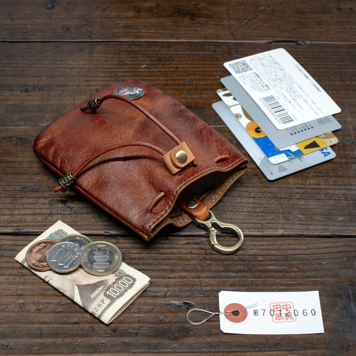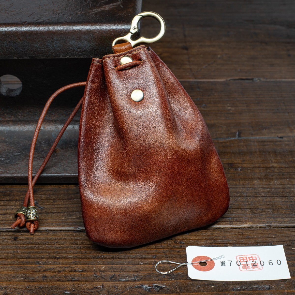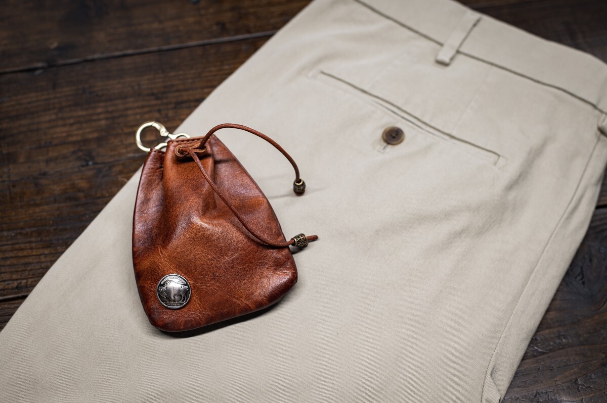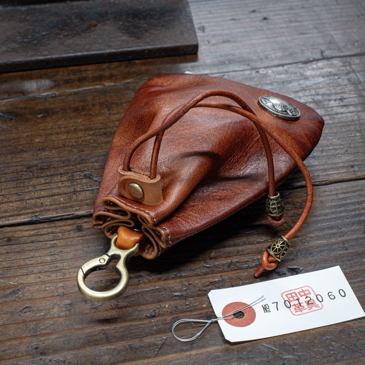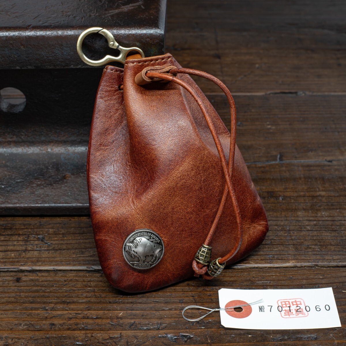 ウォッシュドレザーと呼ばれる本革を使った小さな革袋です。袋の口は革ひもで縛る仕様で、中の物を丁寧に扱いたいときに重宝します。表面には白銅のコンチョが取り付けられ、武骨でヴィンテージ感のある雰囲気に仕上がっています。