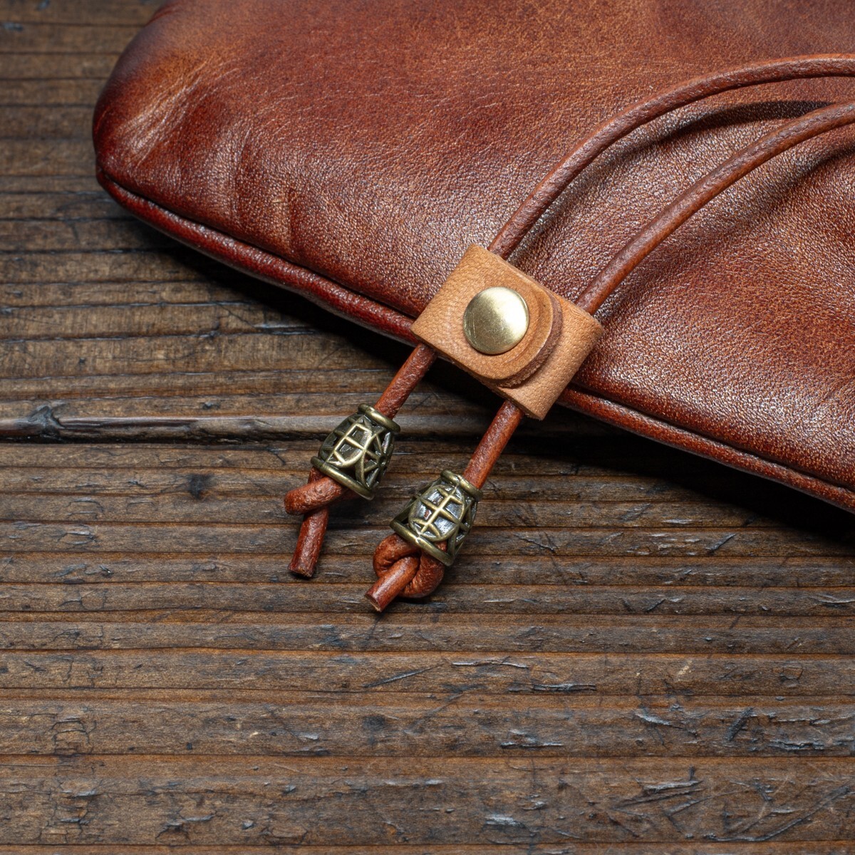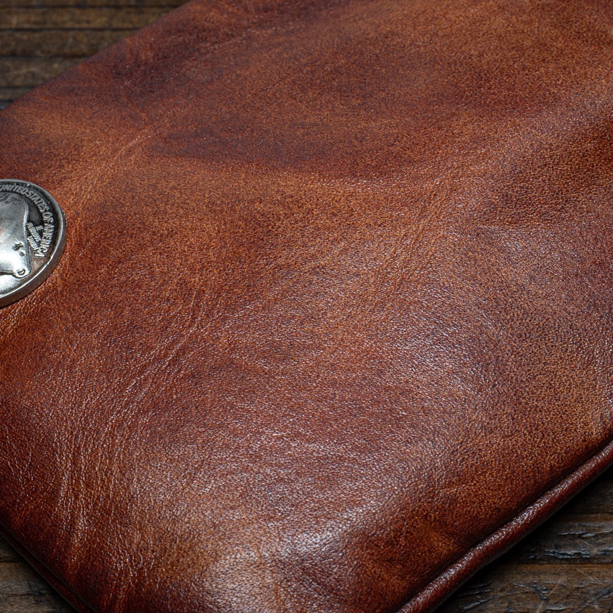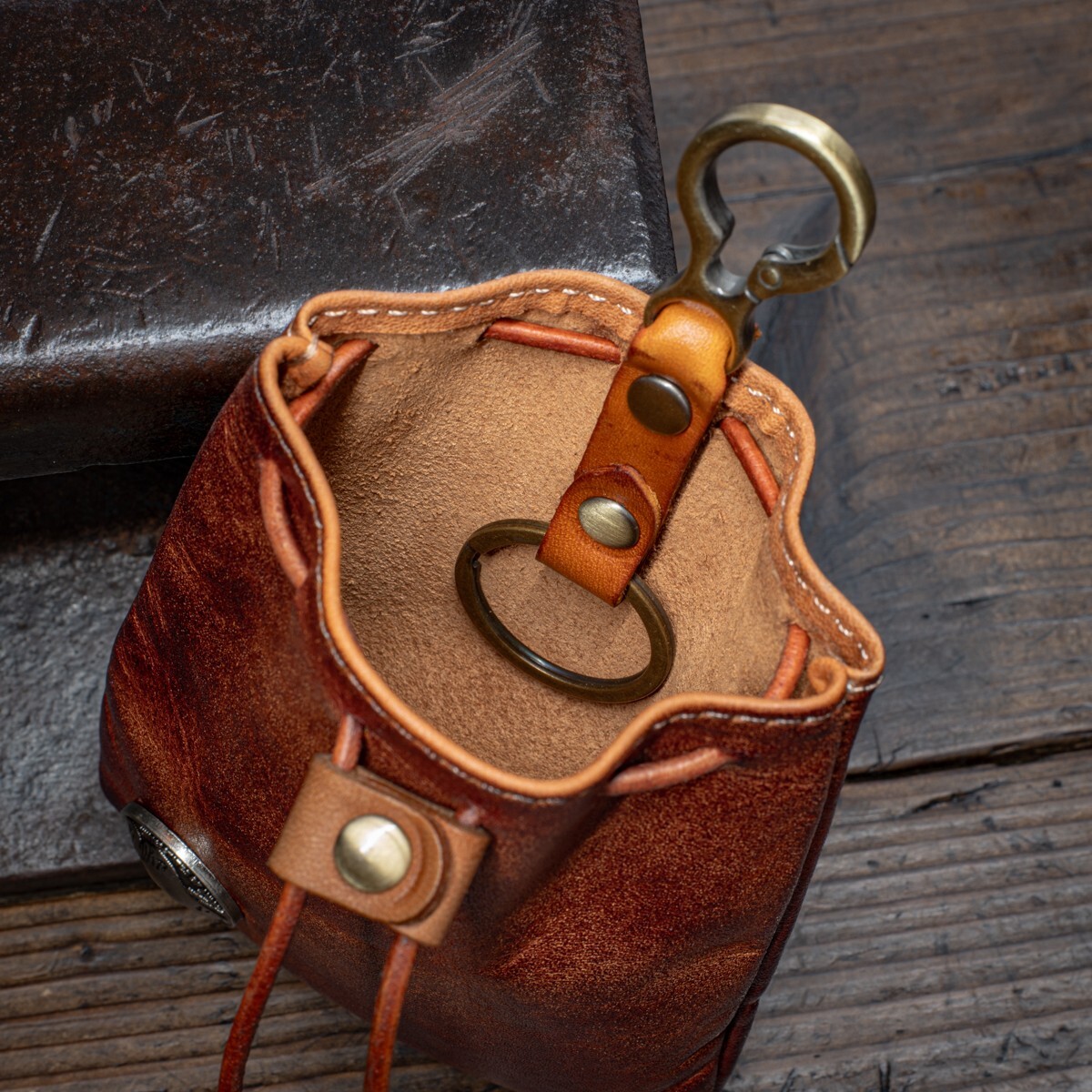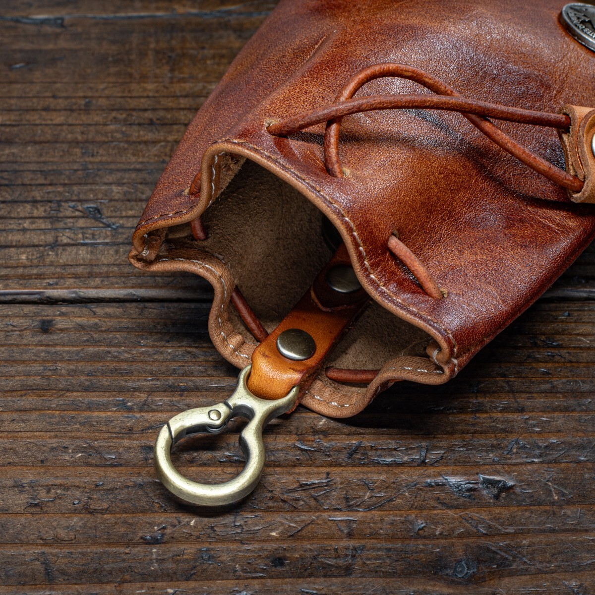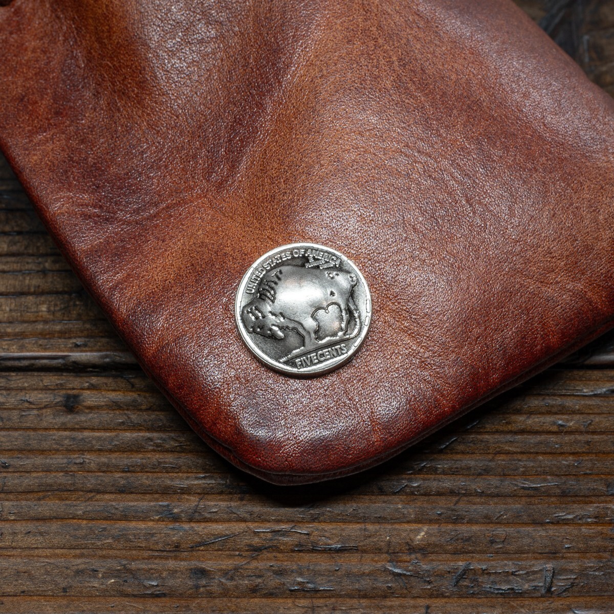 ウォッシュドレザーと呼ばれる本革を使った小さな革袋です。袋の口は革ひもで縛る仕様で、中の物を丁寧に扱いたいときに重宝します。表面には白銅のコンチョが取り付けられ、武骨でヴィンテージ感のある雰囲気に仕上がっています。