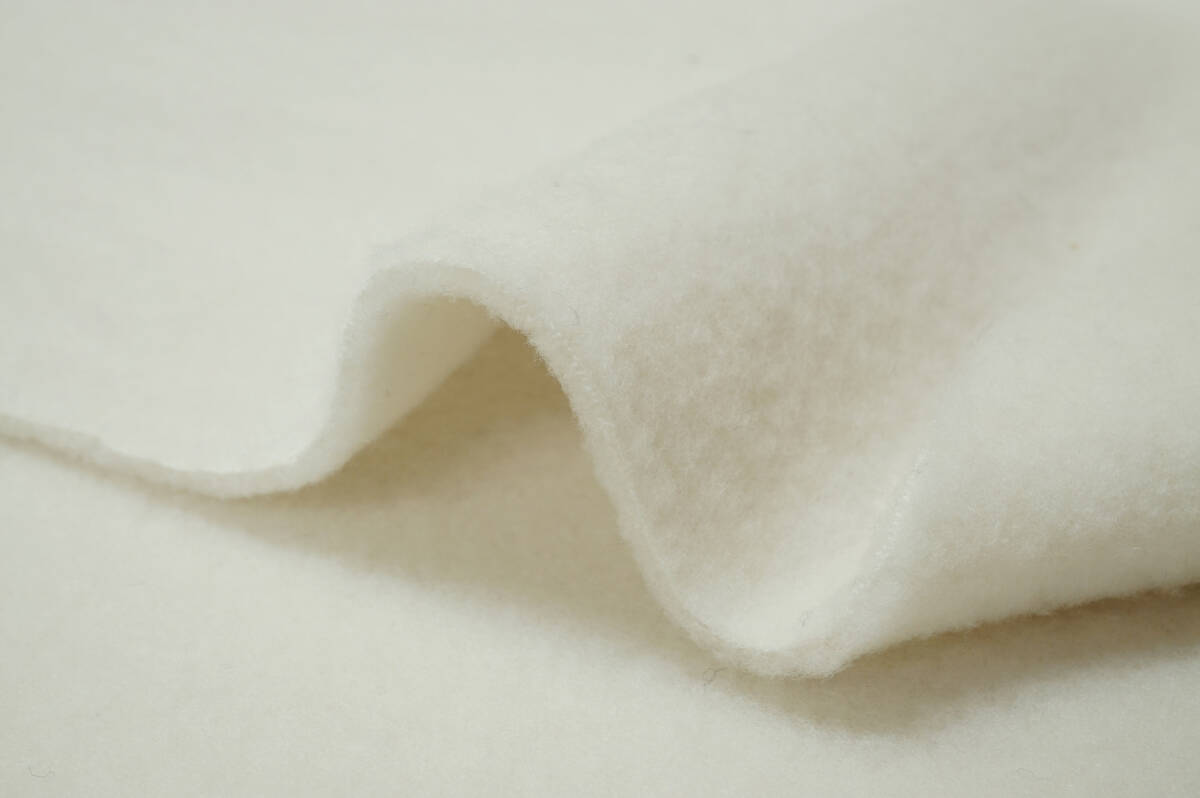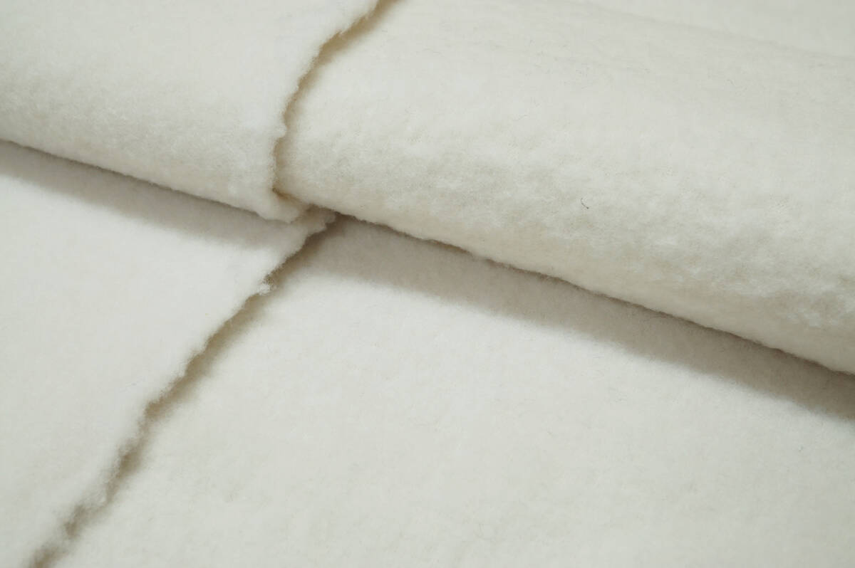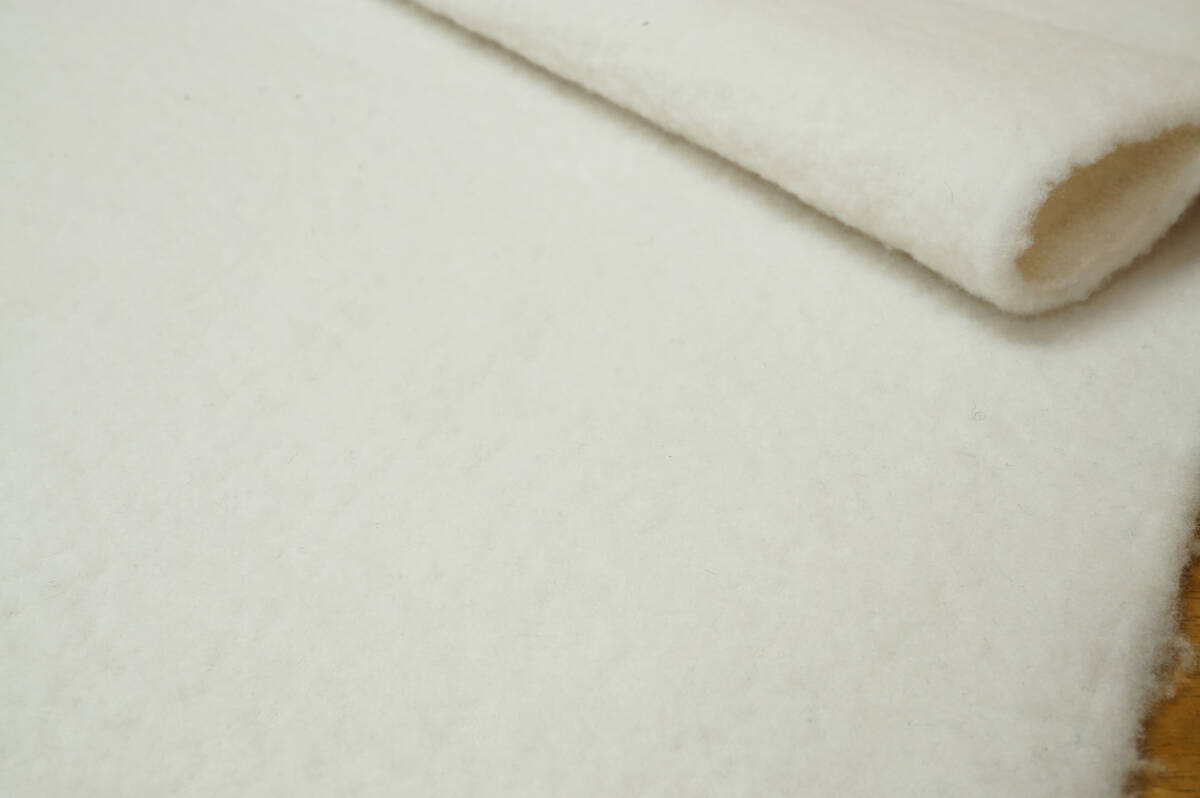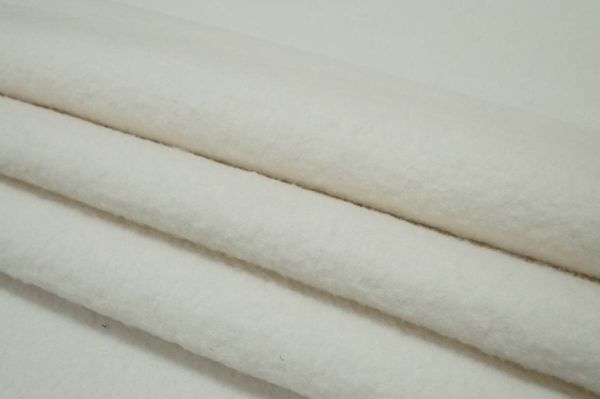 ウール・アクリル混、厚地(断面約4~5mm)、柔らかい風合い、巾方向に伸縮性、色調:アイボリー系で、厚みのあるわりには重量感の無い軽いフリースに似た素材感でございます。