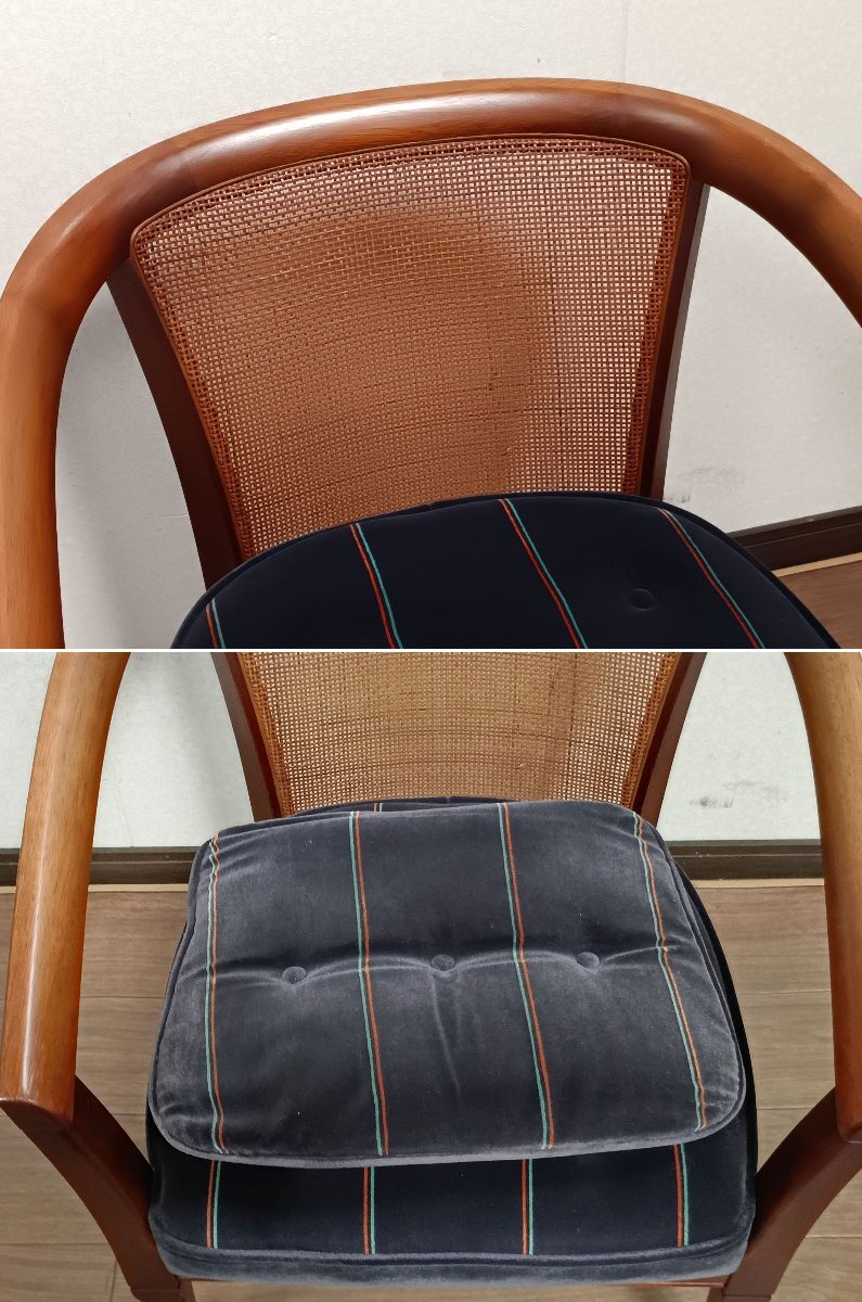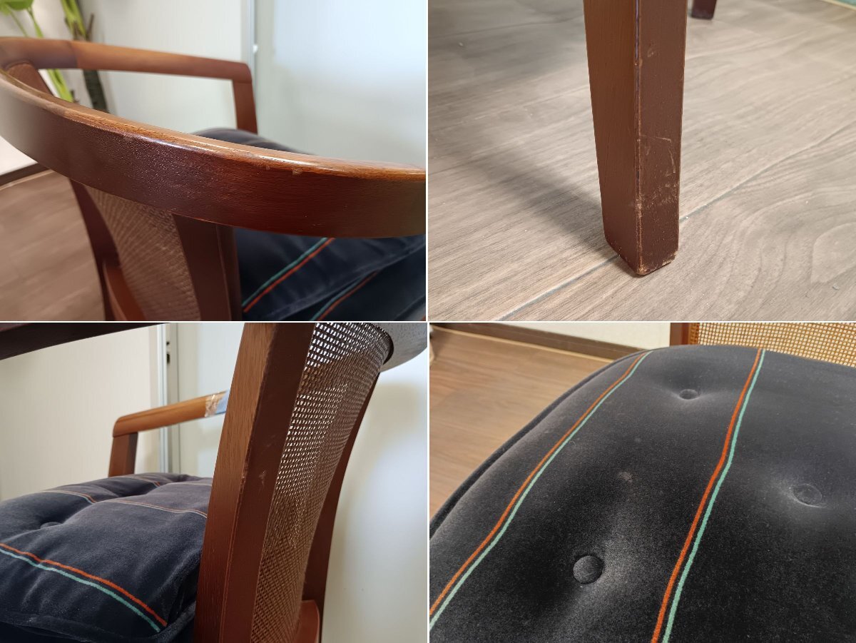 経年使用に伴う若干の擦れ傷やシミ汚れ等があります。 座面や背面クッションに多少の使用感がありますが、 ガタつきもなく、全体としては確りとした造りで使用には支障ありません。
