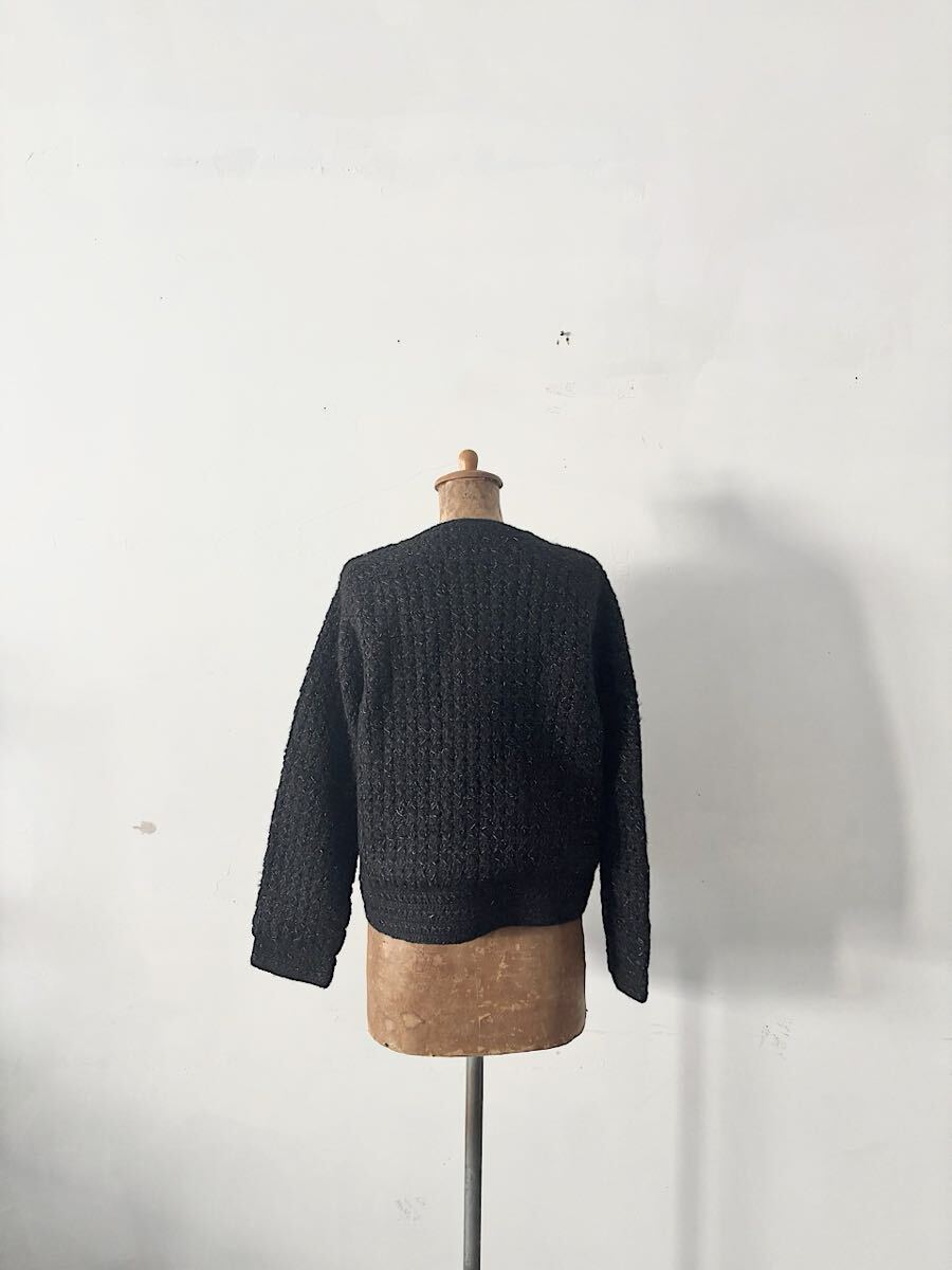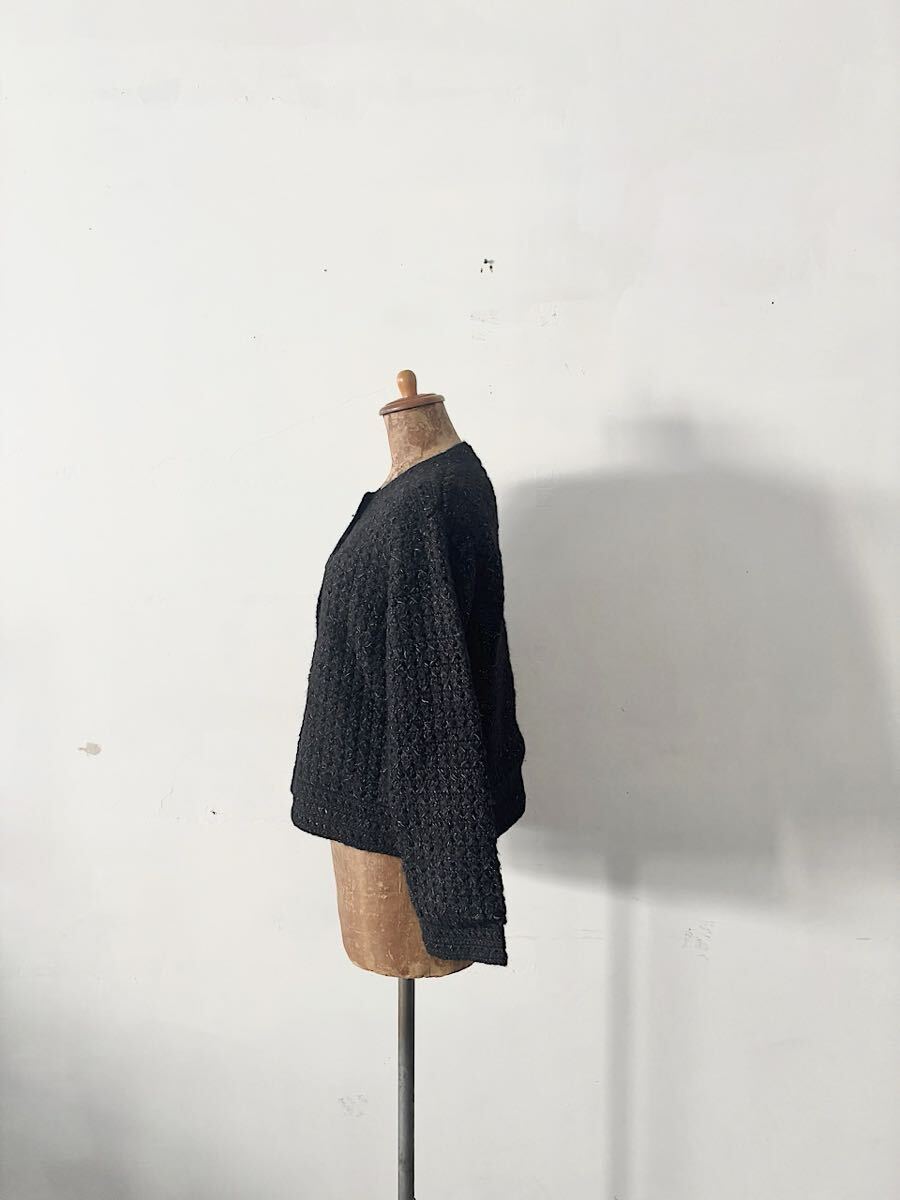 カラーはブラックミックスで、ウール・ナイロン・モヘヤ・アクリル・コットン・ポリエステルの素材を独自の配合で混ぜた糸を手編みで仕上げたカーディガンです。