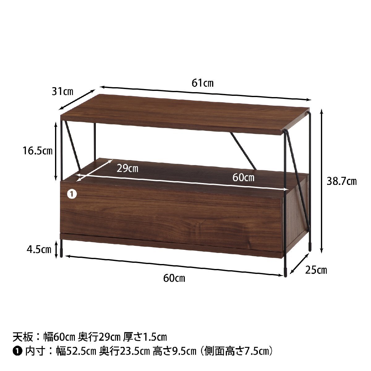 | サイズ | 全体:幅610 × 奥行310 × 高さ387mm 耐荷重(棚板1枚):10kg 棚板厚:15mm 引出内寸:520x235x95mm ※詳細はサイズ画像をご確認ください。 |