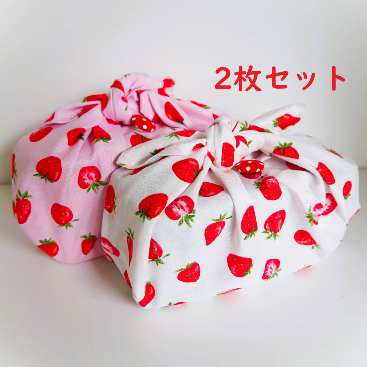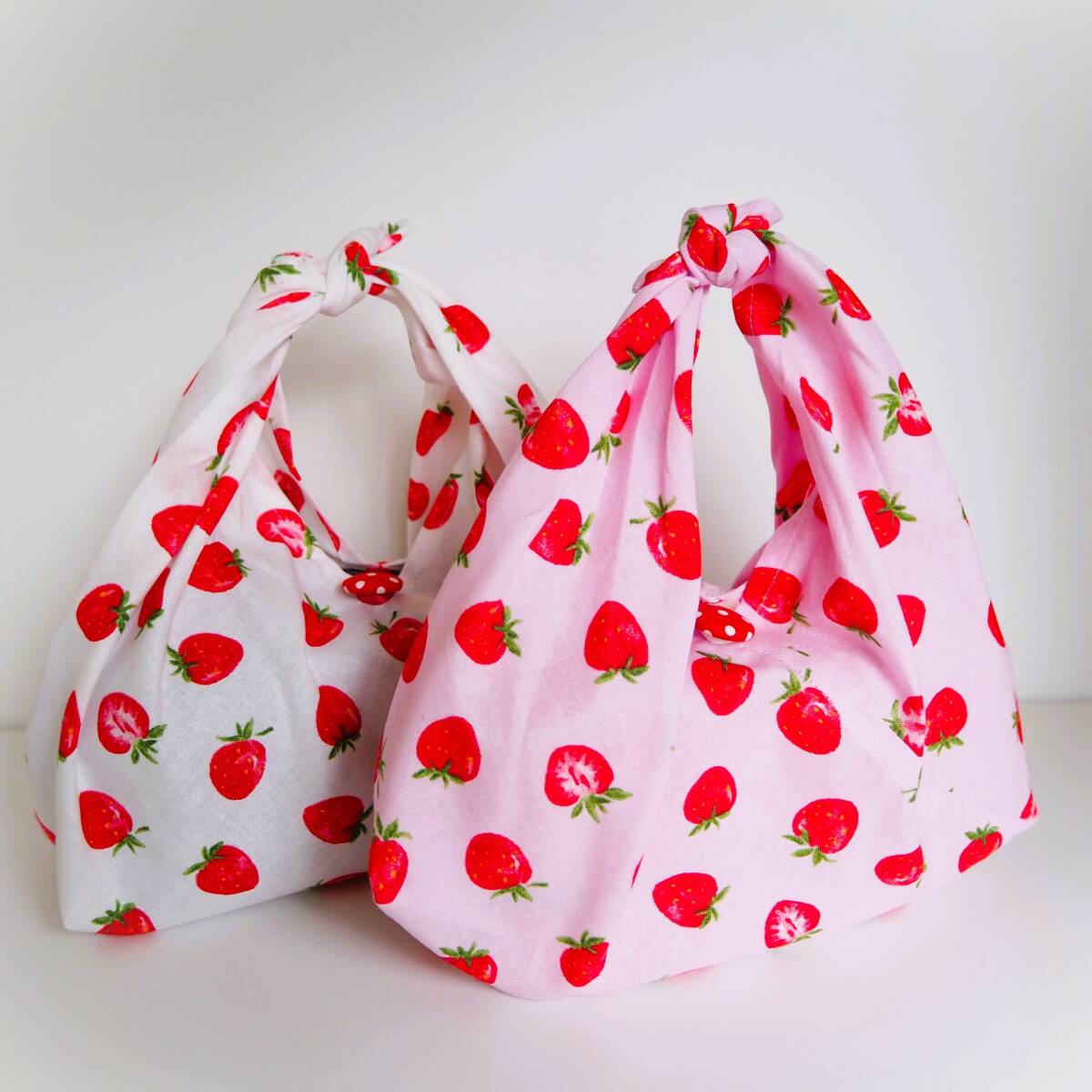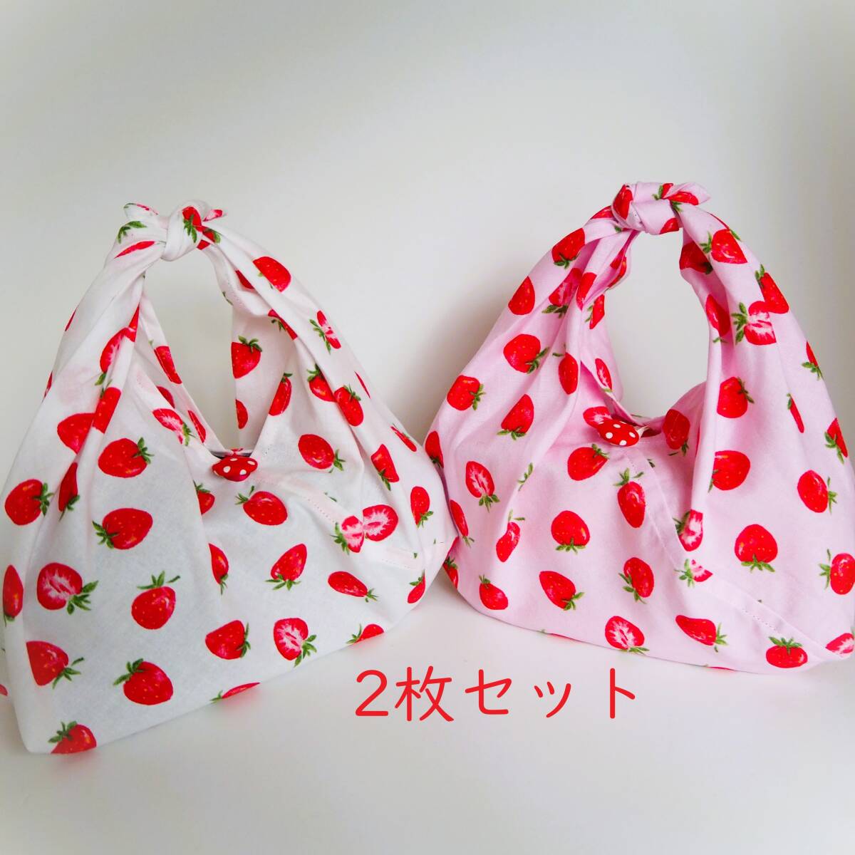 作成キット2枚セット★いちご柄マチ付きあづま袋 くるみボタン付きあずま袋 お弁当包み巾着袋おにぎりポーチの代わりにも!手作りキット