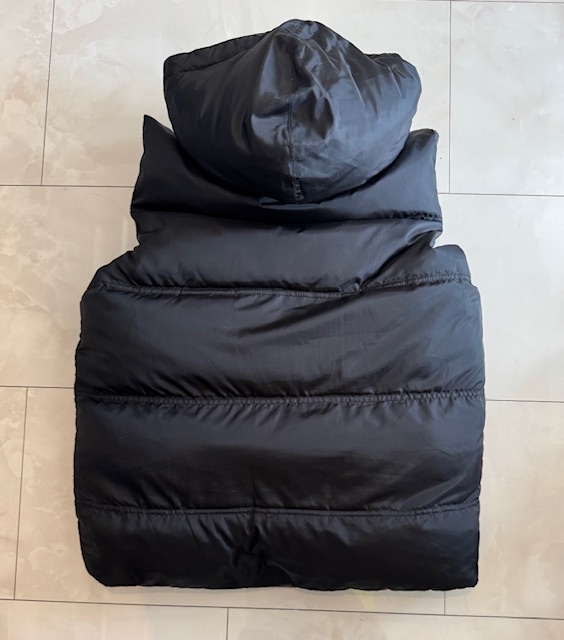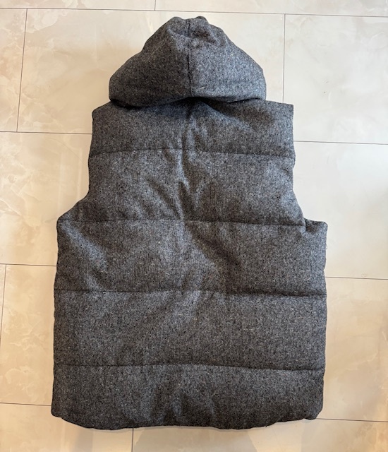 表面はグレーのジャガード織生地、裏面はブラックナイロンの無地のダウンベスト。フードにもダウンが入っており、これからの季節から冬に至っても重ね着すれば十分活躍するベストです。取り外し可能なフードは表、裏それぞれで付ける位置を変える事が出来、どちらも襟の後ろから立ち上がる、と言う細かな配慮も伺えます。