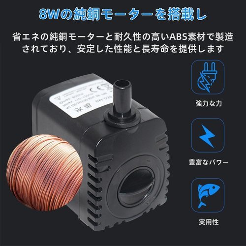 本製品は、8Wのパワフルな電力で動作し、最大1.2mまで水を持ち上げることができる高性能水中ポンプです。最大流量はL/Hに達し、8/12mmの2種類の出水口ノズルを備えており、多様な水流ニーズに柔軟に対応します。超静音設計により、4デシベル以下の低騒音で、静かな環境での使用に適しています。省エネの純銅モーターと耐久性の高いABS素材で製造されており、安定した性能と長寿命を提供します。また、簡単なメンテナンスと広範な適用性を持ち合わせており、水族館、噴水、灌漑システムなど様々な場所での水循環に最適です。