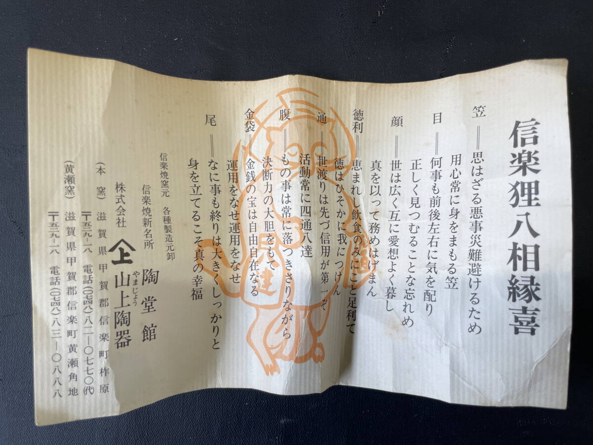 9-B85/3-80 信楽焼 たぬき 置物 山上陶器 陶堂館 縁起物 信楽狸八相縁喜 商売繁盛 招福 高さ約27㎝ 説明書付き | |||