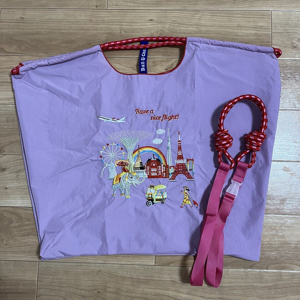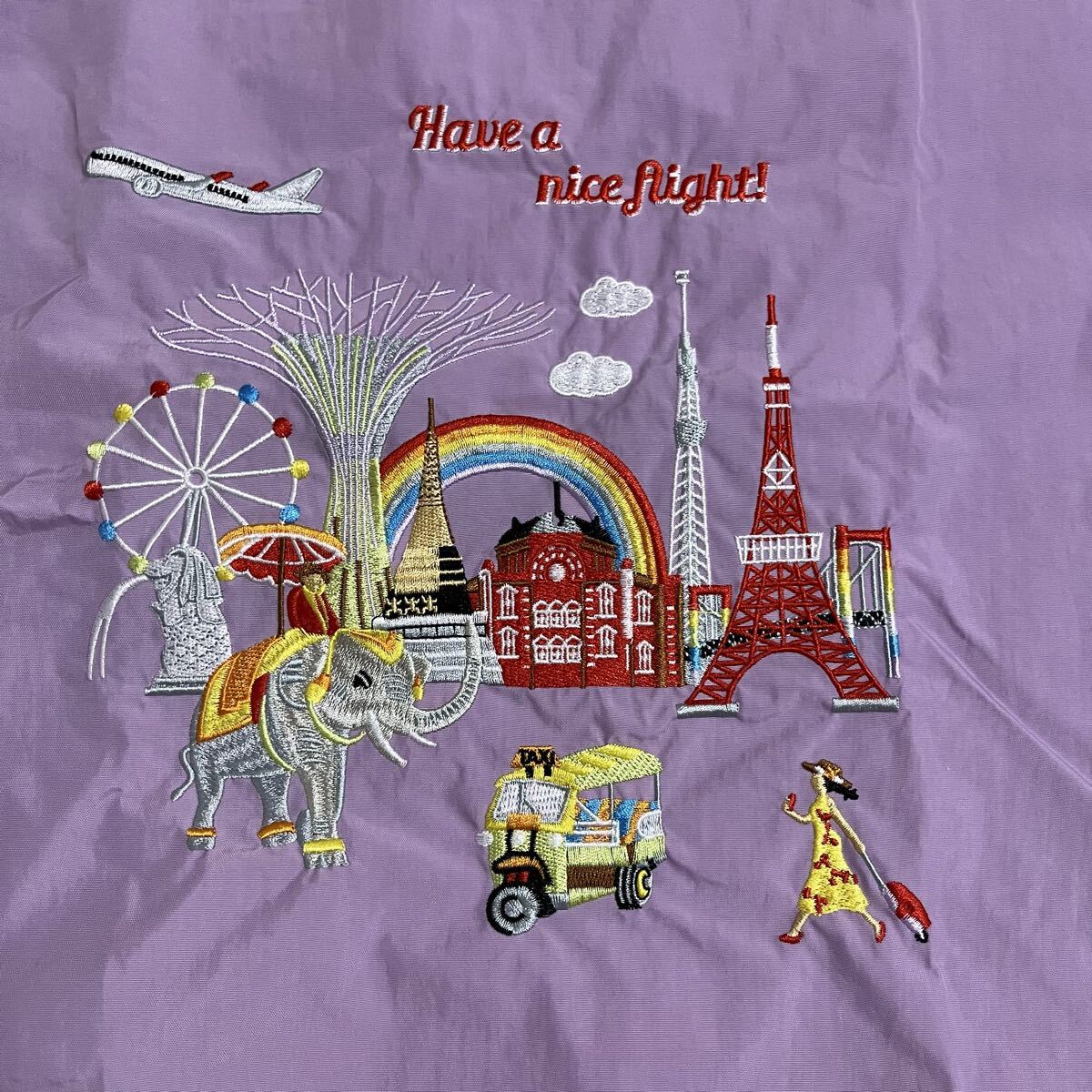 東京、タイ、シンガポールを舞台に旅の名所や飛行機が色鮮やかに描かれている刺繍がポイントです♪