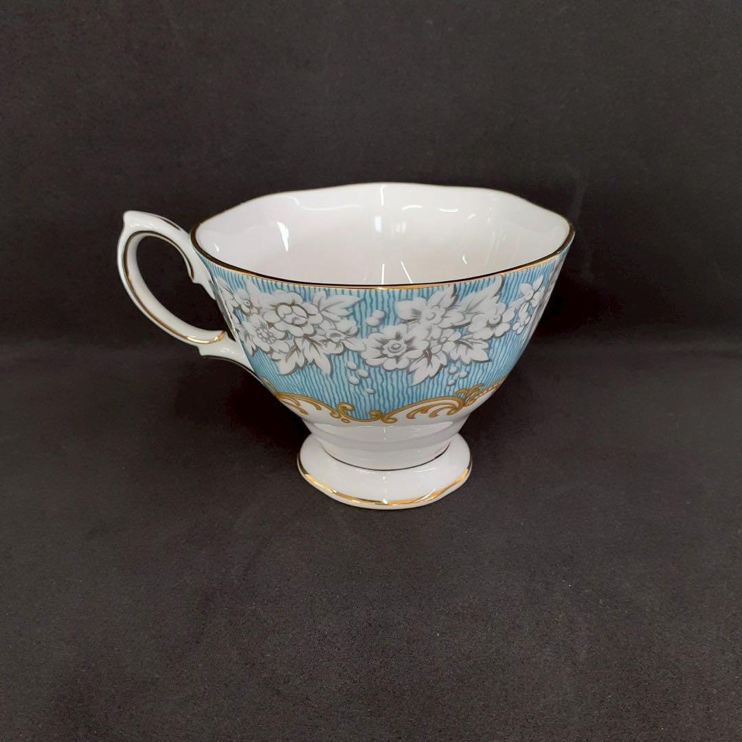 青と白の花柄の陶器製ティーカップとソーサー、金縁付きのエレガントなデザイン。