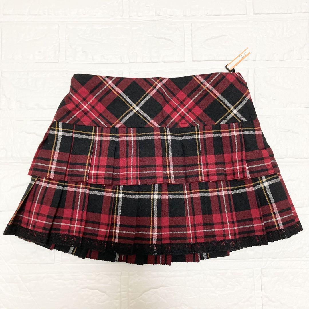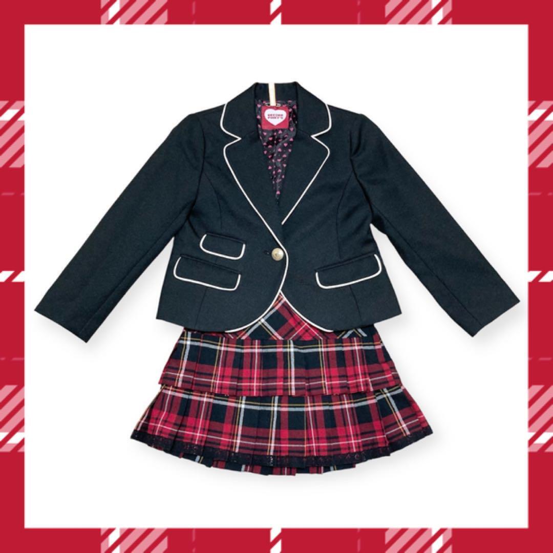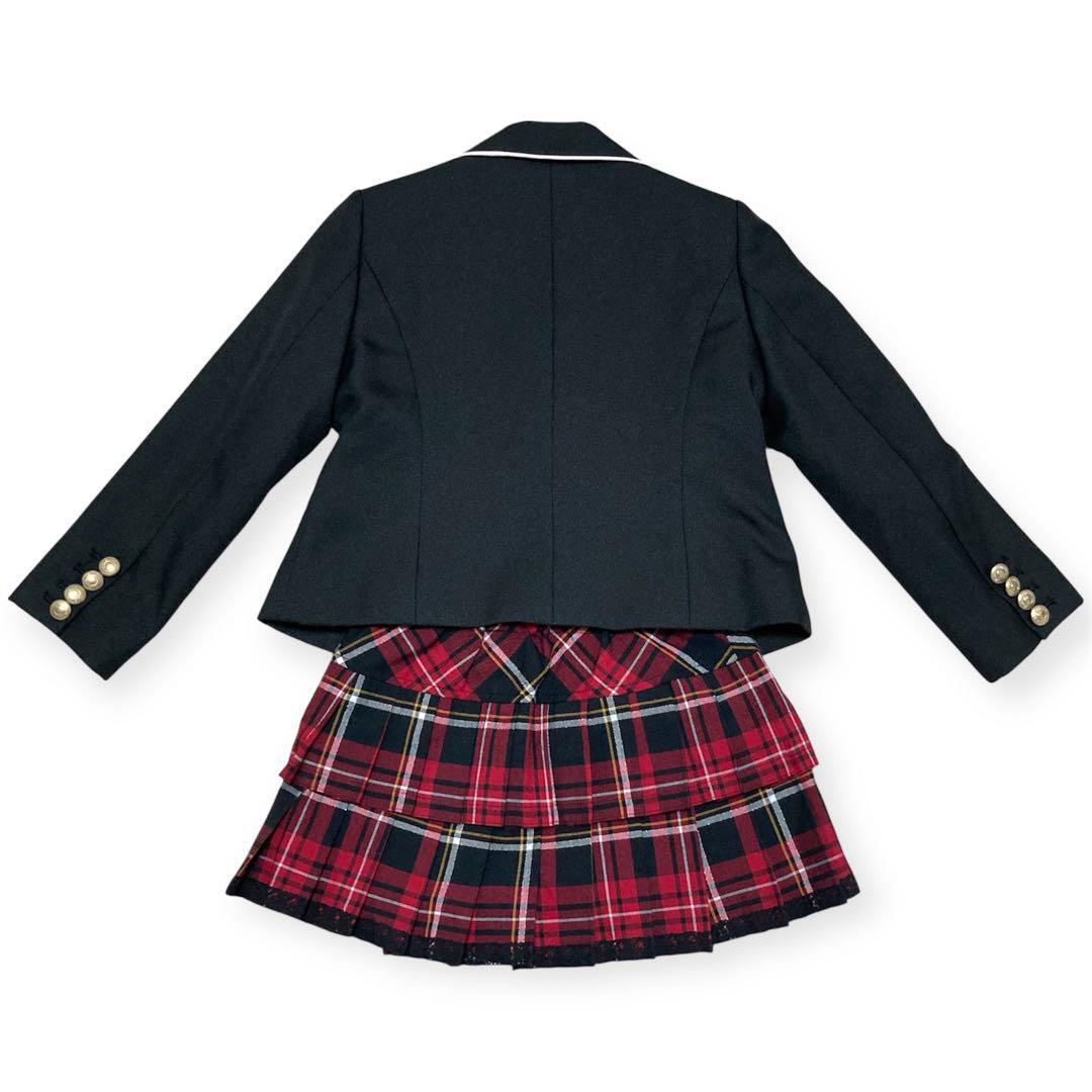 ブレザーは黒で、下は2段のプリーツスカートで赤とブラックのチェック柄です。