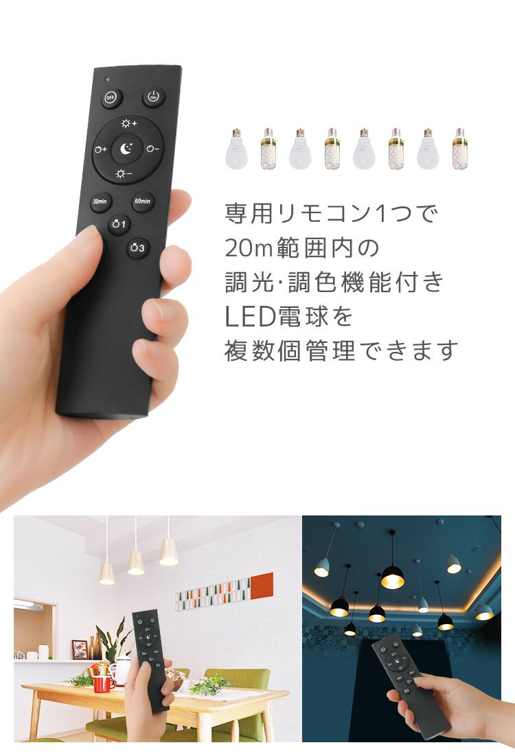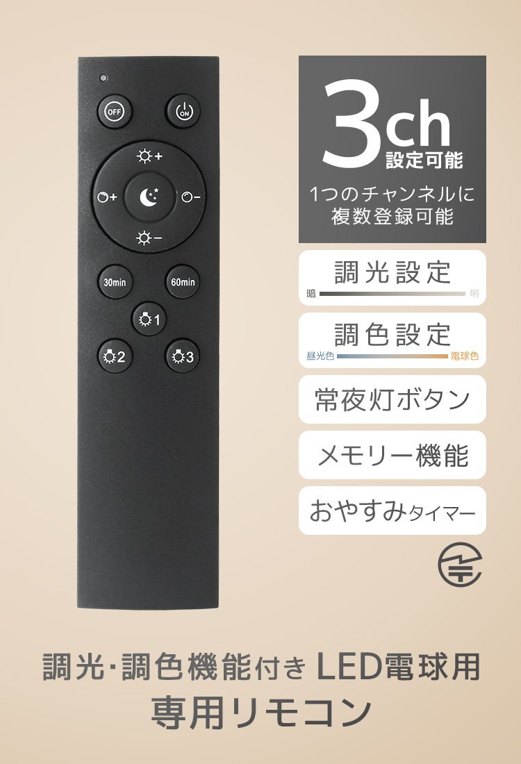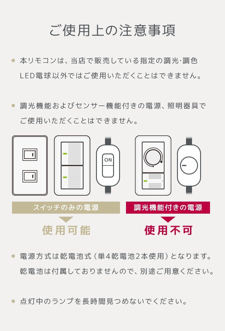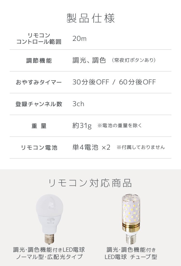 調光調色機能付きLED電球専用リモコンです。 20m範囲内であれば複数個の電球を管理できます。 ボタンを押すだけでセットできる「おやすみタイマー」機能搭載! 30分後と60分後が選べ、時間になると自動消灯します。 常夜灯ボタン付き!睡眠の邪魔をしない明るさです。 便利なメモリー機能! 設定した明るさと点灯色が自動的に記憶されます。 複数の照明があっても大丈夫! リモコン1つで複数の照明を操作でき、個別で調整できます。 【商品仕様】 サイズ:(約)3.8×15cm 重量:(約)31g 調節機能:調光、調色(常夜灯可能) おやすみタイマー:30分後OFF / 60分後OFF 登録チャンネル数:3ch コントロール範囲:20m リモコン電池:単4電池×2(付属しておりません) 【対応商品】 調光調色機能付きLED電球(LEDDM1A / LEDDM6A / LEDDM6B) |