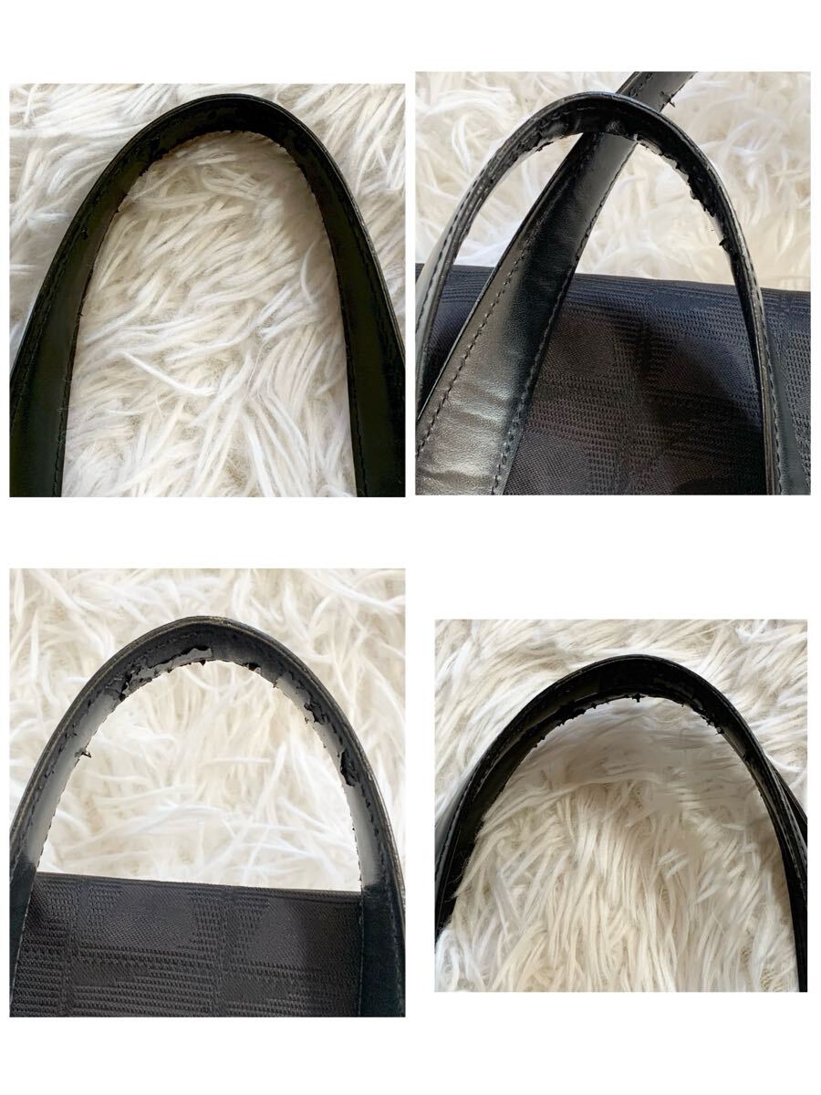 外側前後、側面、底面、袋口裏、持ち手、内部ストラップにシミがございます。気になる場合はクリーニングなどしていただいてからの使用をお勧めします。