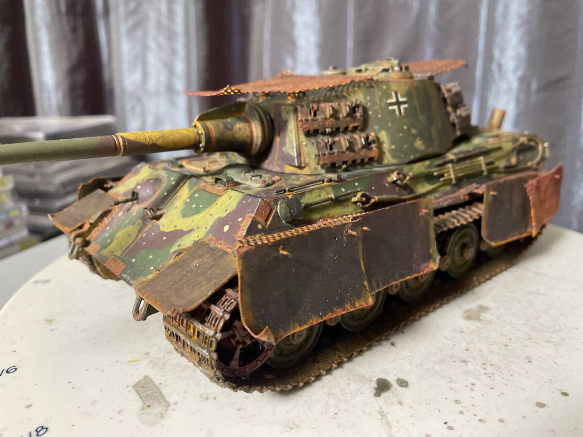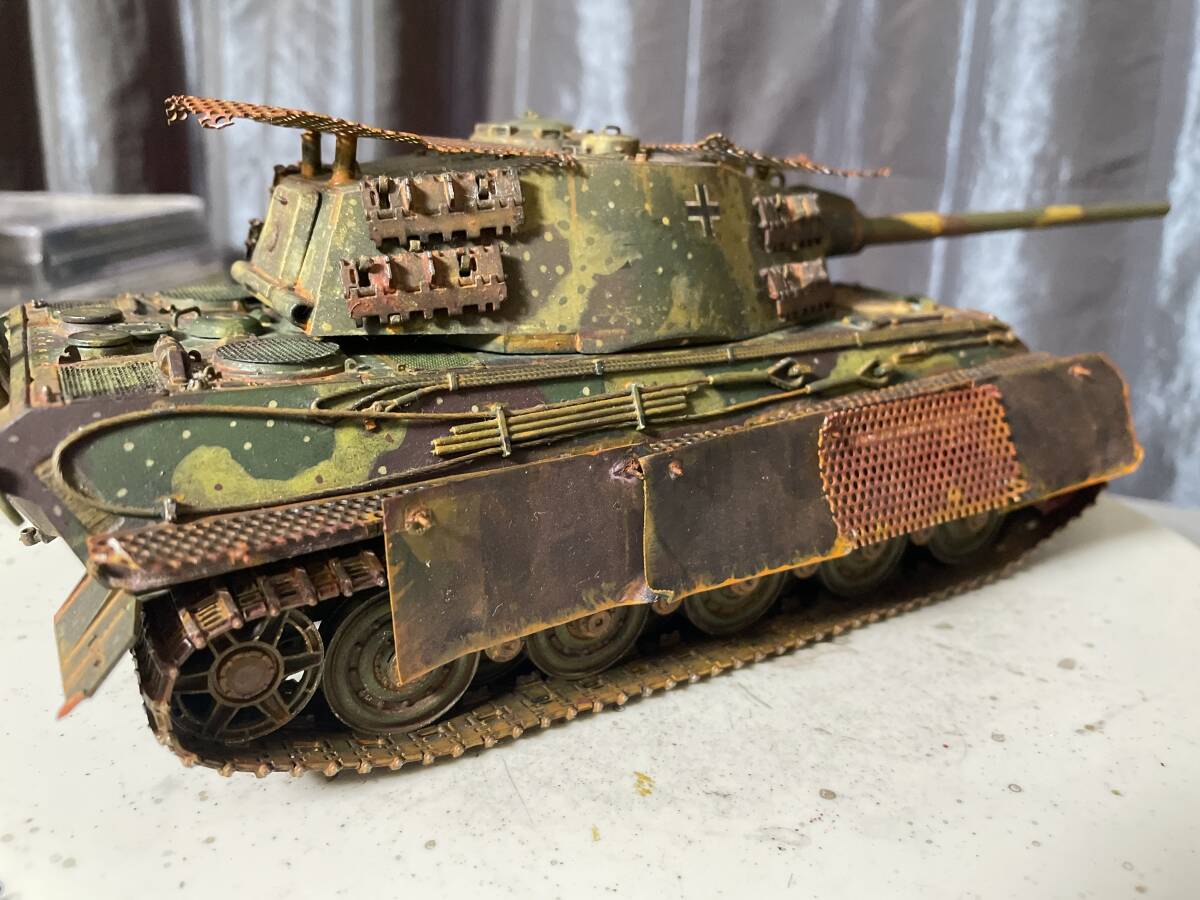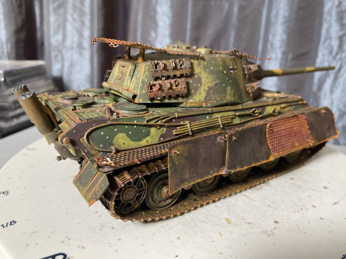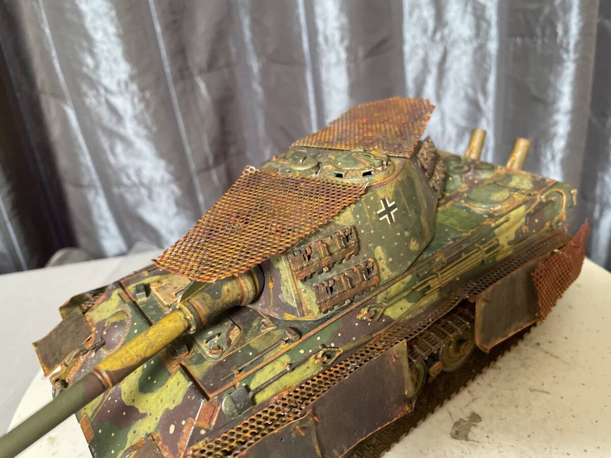 使用状況:ドイツ計画戦車タイガーⅡ 110ミリ砲搭載車塗装済完成品です。1945年7月から登場する予定であった数種類の計画戦車の一つで110ミリ砲を搭載した車両です。大戦末期特有の塗装に車体両側面及び砲塔上面にPS板及び応急鉄板を使用した増加装甲をややラフに装着した状態を製作しました。車体部はドラゴンキット、砲塔部はタミヤキットを使用し、車体部の砲塔挿入口を拡幅加工して組み込んでおります。実戦である程度使い込まれた車両をイメージし大戦末期の強い酸性雨に晒されて鋼板特有の黄色いサビが諸所に発生した状態を表現しております。塗料は基本色をエナメル、仕上げにアクリル塗料を使用しすべて手塗りで丁寧に仕上げました。ピグメントも使用しておりません。履帯はタミヤのラバーベルト製履帯を使用。エンジングリルのエッチングパーツもキット付属品を使用しております。