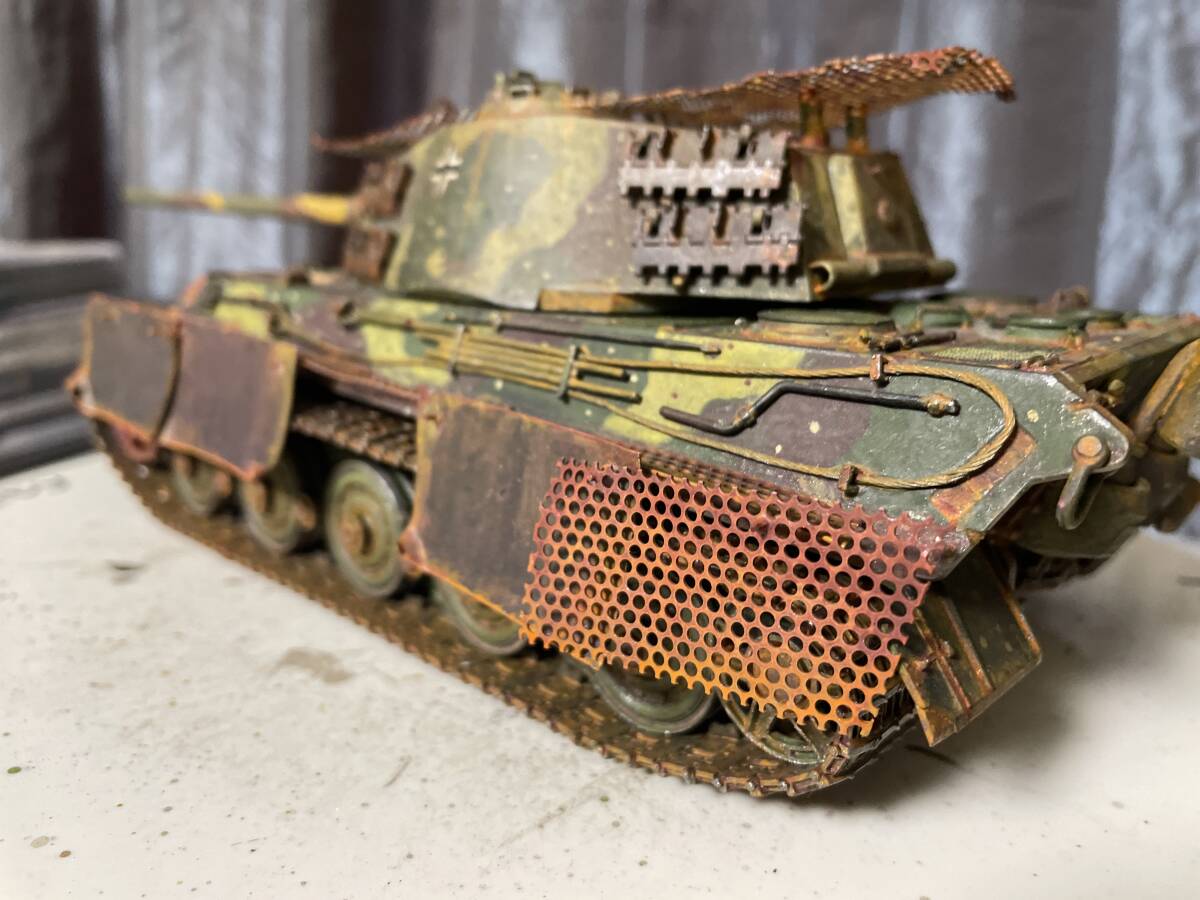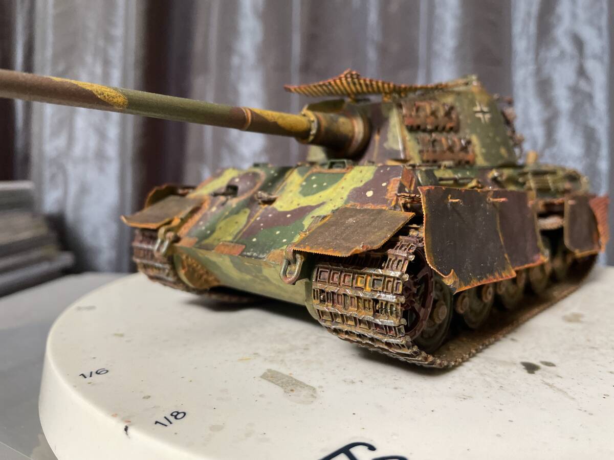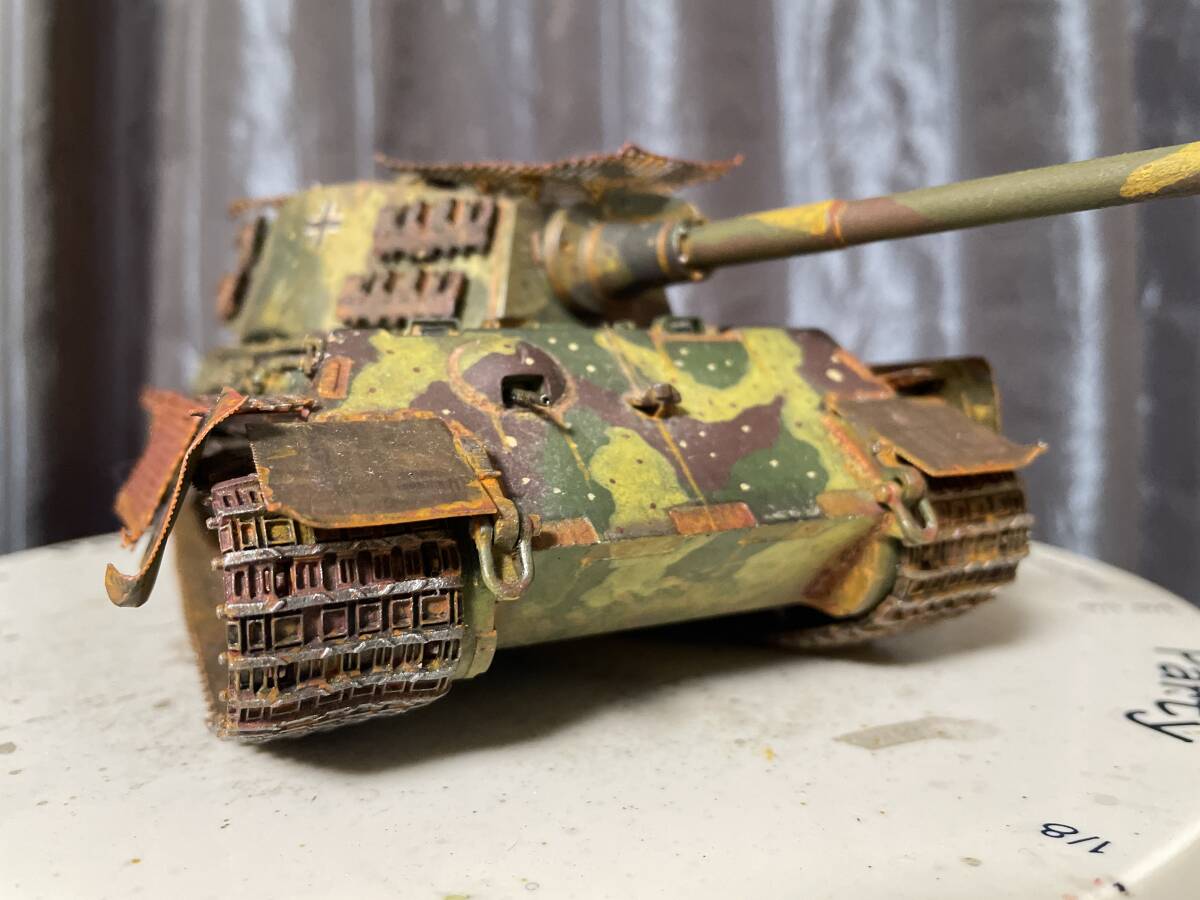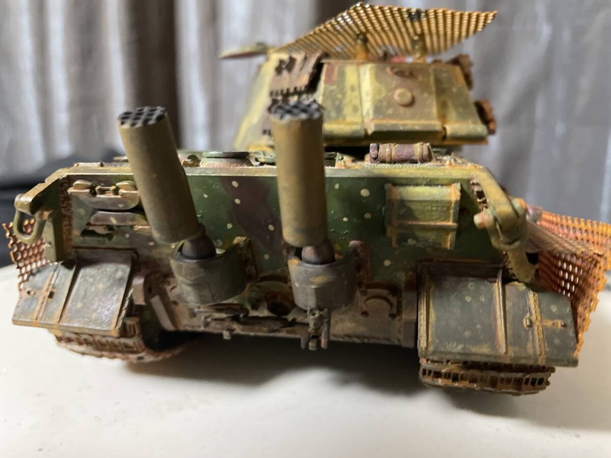 使用状況:ドイツ計画戦車タイガーⅡ 110ミリ砲搭載車塗装済完成品です。1945年7月から登場する予定であった数種類の計画戦車の一つで110ミリ砲を搭載した車両です。大戦末期特有の塗装に車体両側面及び砲塔上面にPS板及び応急鉄板を使用した増加装甲をややラフに装着した状態を製作しました。車体部はドラゴンキット、砲塔部はタミヤキットを使用し、車体部の砲塔挿入口を拡幅加工して組み込んでおります。実戦である程度使い込まれた車両をイメージし大戦末期の強い酸性雨に晒されて鋼板特有の黄色いサビが諸所に発生した状態を表現しております。塗料は基本色をエナメル、仕上げにアクリル塗料を使用しすべて手塗りで丁寧に仕上げました。ピグメントも使用しておりません。履帯はタミヤのラバーベルト製履帯を使用。エンジングリルのエッチングパーツもキット付属品を使用しております。