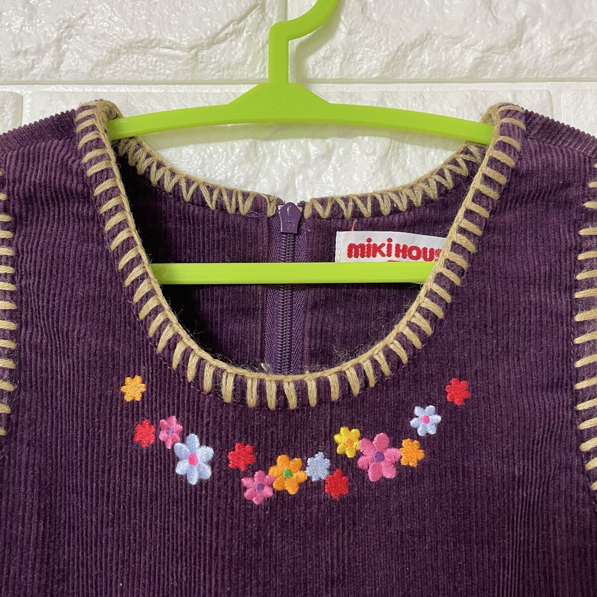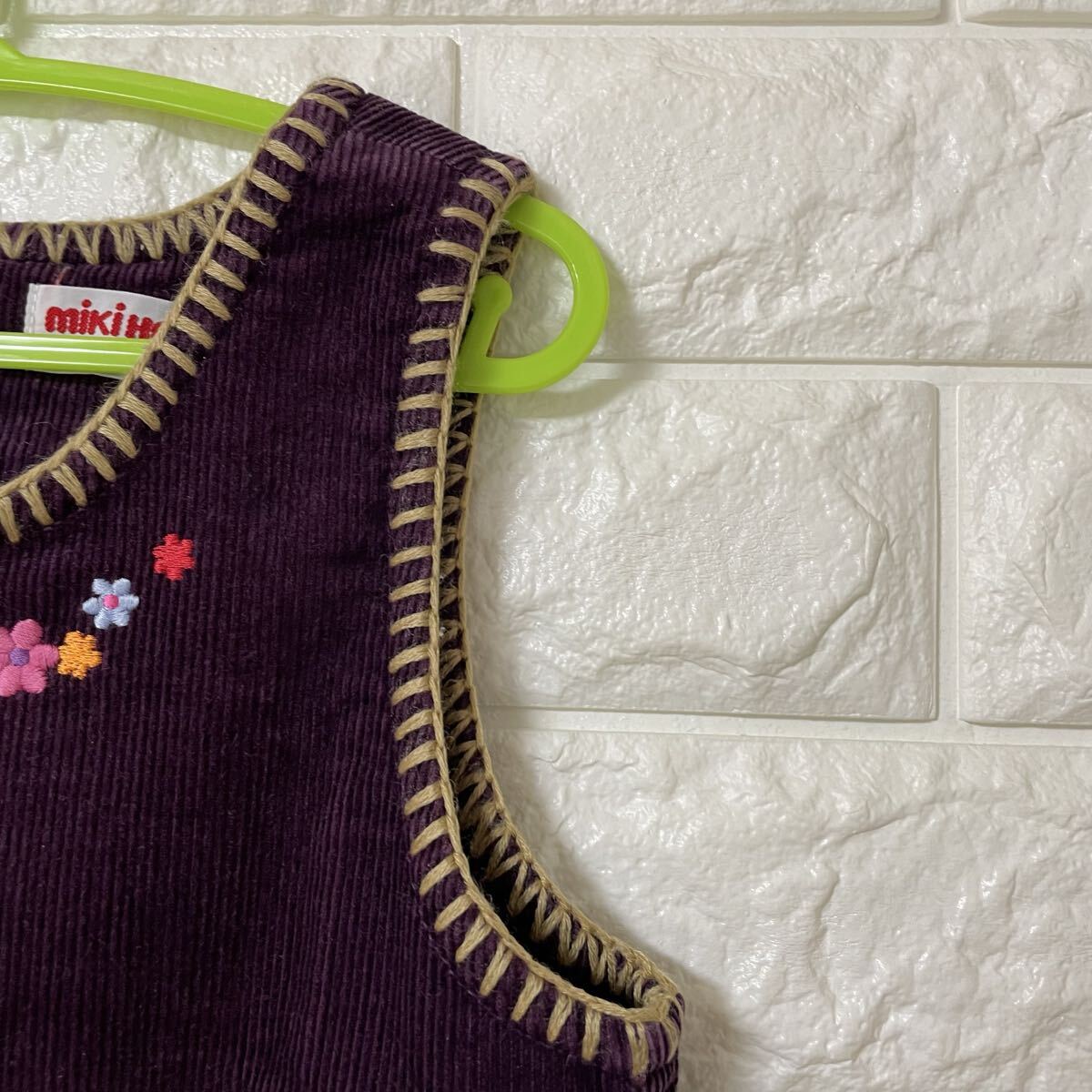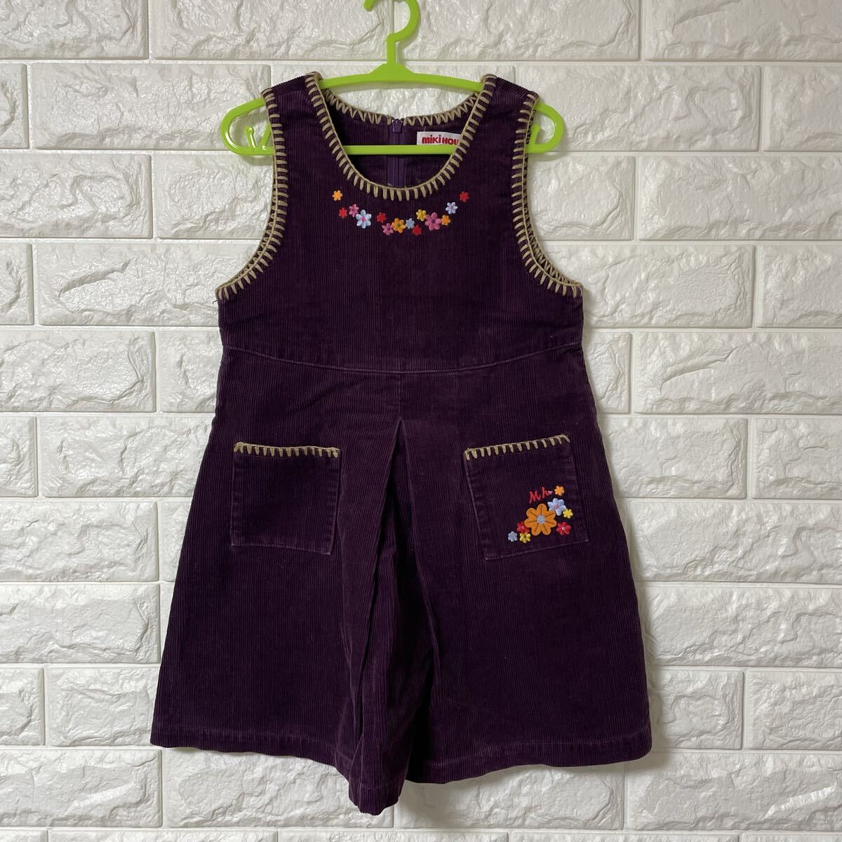 ミキハウスのコーデュロイワンピース、ジャンパースカートです。レトロな雰囲気の花柄刺繍が可愛らしいデザインです。秋冬のお出かけにぴったりです。