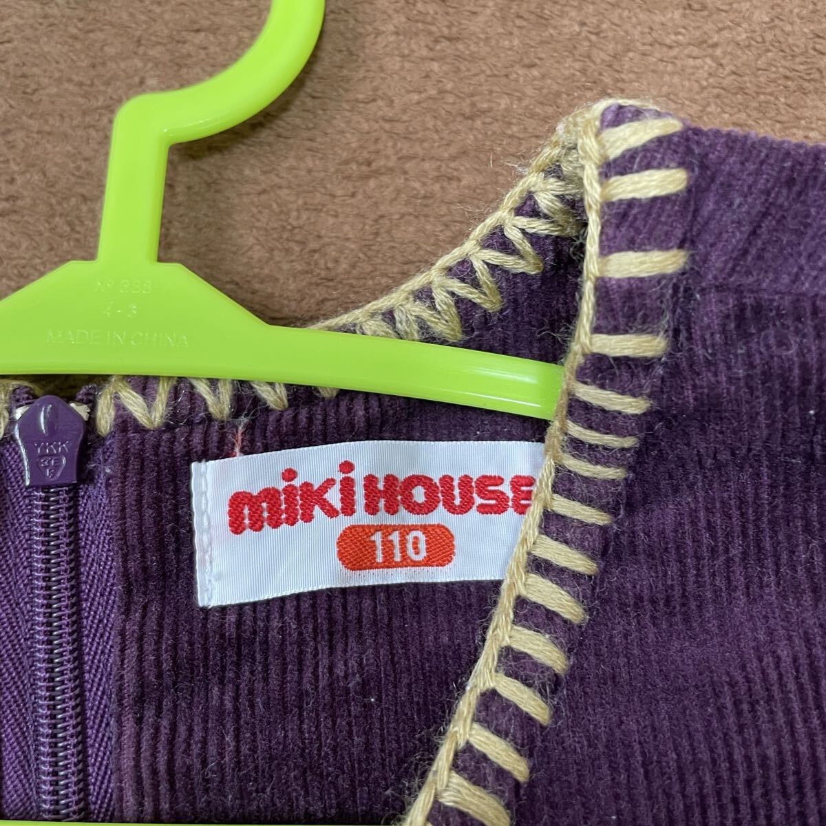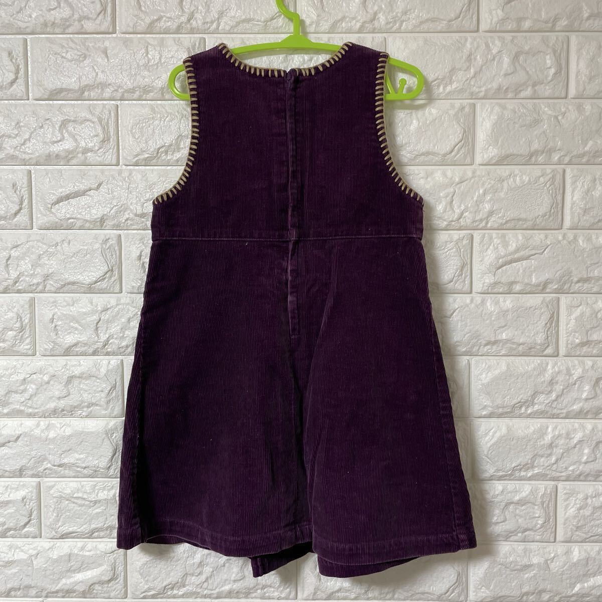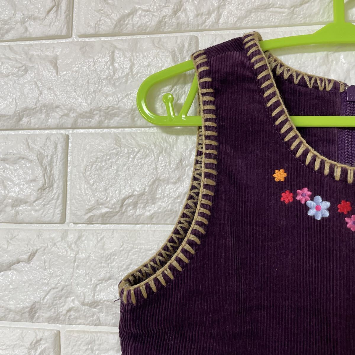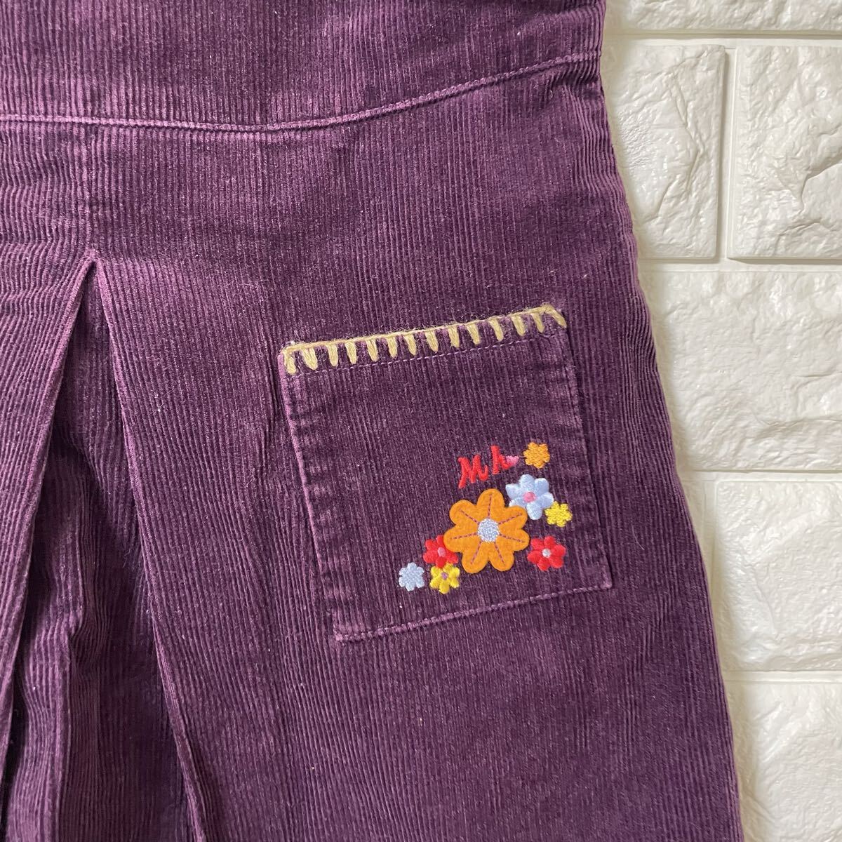 ミキハウスのコーデュロイワンピース、ジャンパースカートです。レトロな雰囲気の花柄刺繍が可愛らしいデザインです。秋冬のお出かけにぴったりです。