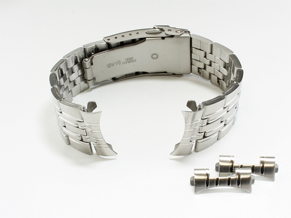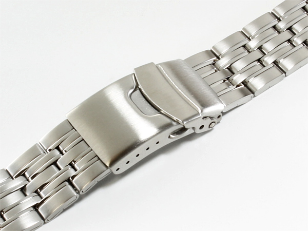 バンビ 18mm幅、20mm幅弓かん対応 Wロック&プッシュ式三つ折れ ステンレス 腕時計バンド BSBE1125S 18mm幅、20mm幅の弓かん対応の Wロック&プッシュ式三つ折れ ステンレス時計バンドです。 その他のかん幅でもストレートフィット管をアダプターとして使用することにより 弓かん対応以外の時計でも取り付けができます。(8mmから20mmまで) ストレートフィット管(無地)ご希望の際は1サイズのみ無料でお付けいたします。 (9mmから20mmまでの1mm単位です。*弓かんではありません。) 取引ナビにてお申し付け下さい。 又、かん足の長さや時計の弓カーブやデザインによっては 取り付けが出来ない場合もございます。 ※モニターや撮影照明の影響により、 実物との色あいが異なる場合があります。予めご了承ください。