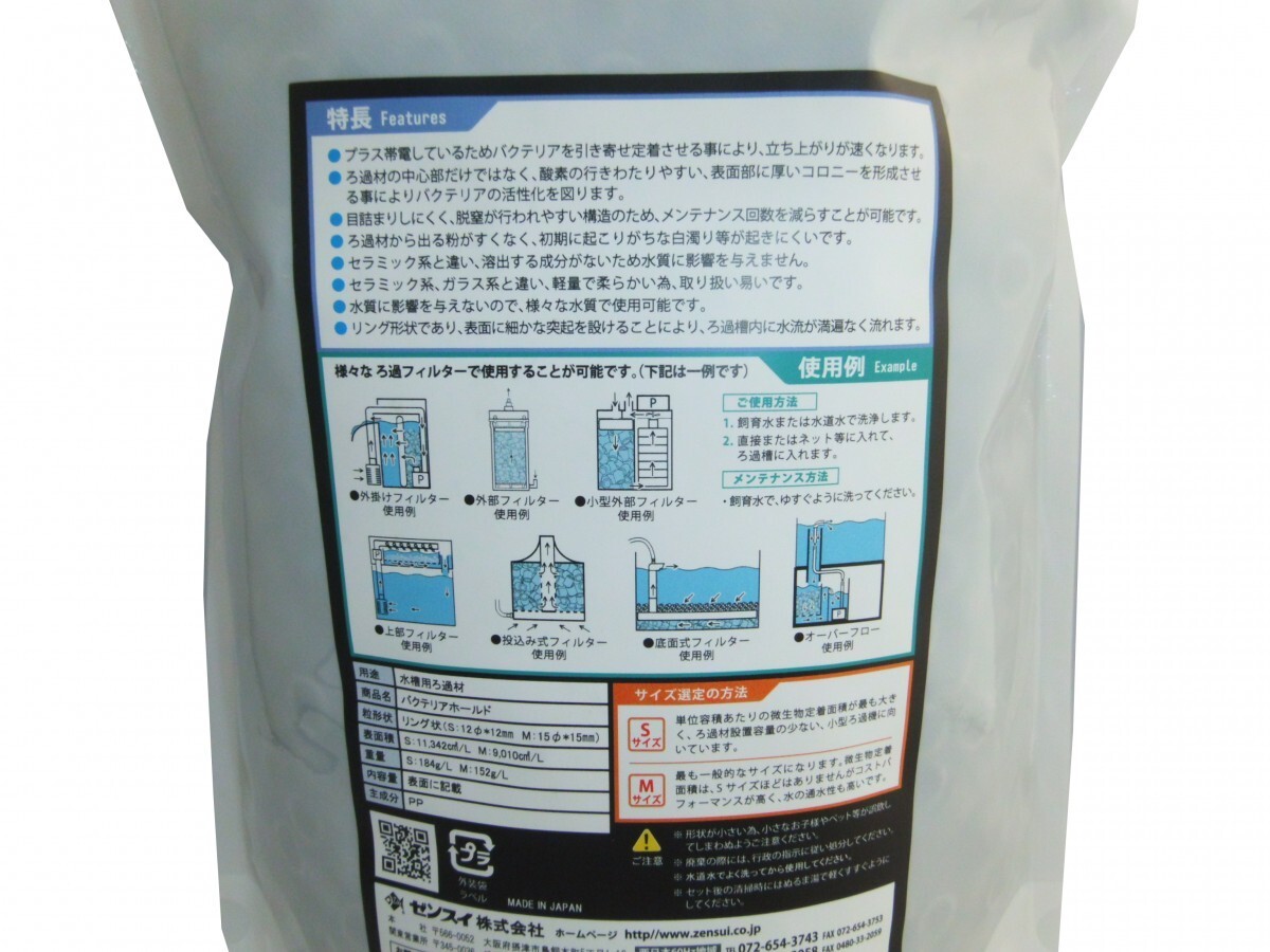 | 商品名:バクテリアホールドS 3L バクテリアを引き寄せる新素材のリングろ材です。 プラス帯電を行わせバクテリアを引き寄せ定着せさ、 短時間で立ち上げます。 表面部に厚いコロニーを形成させる事により、バクテリアの活性化 を図ります。 目詰まりしにくく、脱窒が行われやすい構造のため、メンテナンス回数を 軽減出来ます。 ろ過材からでる粉が少なく、白濁りが起きにくいです。 セラミック系、ガラス系と違い、軽量で柔らかい為、取扱しやすいです。 本品は水に溶出する成分が無く、淡水海水問わず安全に使用出来ます。 リング形成で表面に細かい突起を設けることで、ろ過槽内の水流が 満遍なく流れます。 ■商品仕様 用途:水槽用ろ過材 形状:リング状S12Φx12mm 内容量:3L用 重量:184g/L 主成分:PP ※画像2枚目はS/Mの比較です。 お届けはSサイズ3L用1袋です。 ■注意点 PHやGHに影響は与えませんが、pHを維持することが出来ないため、 海水での使用の場合、珊瑚砂等と合わせてご使用下さい。 |