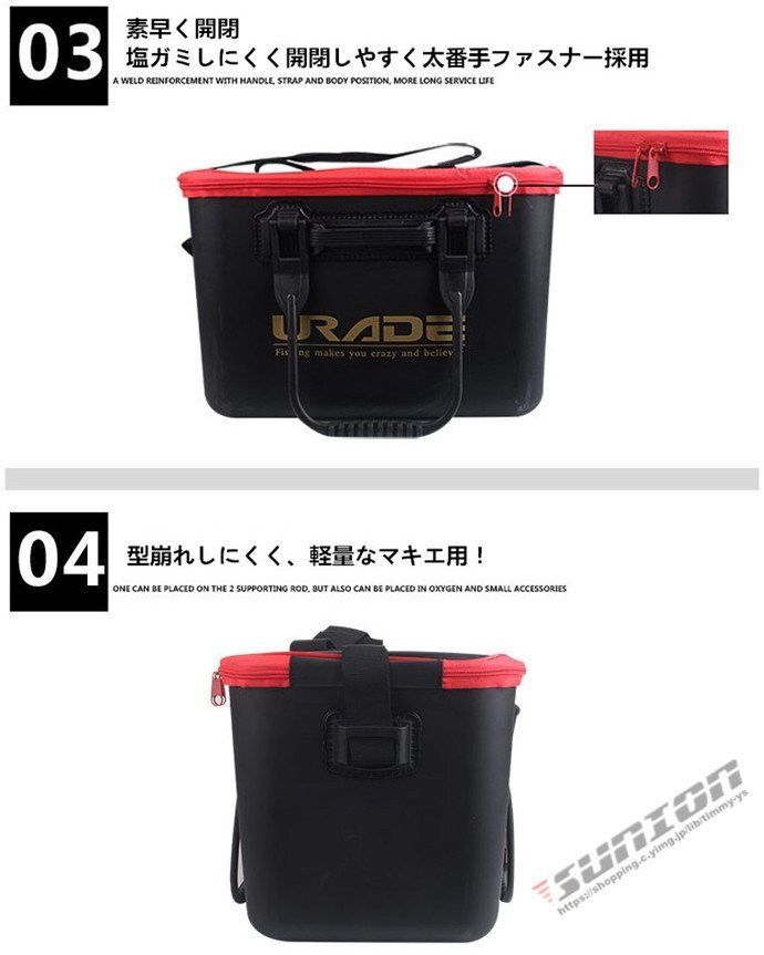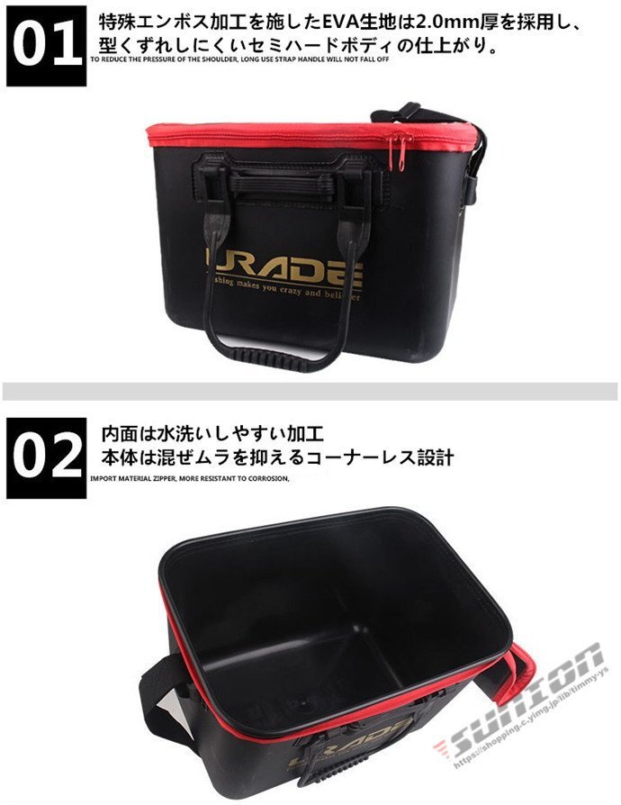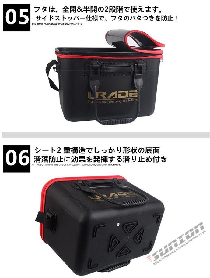 [商品特徴]●肉厚EVA素材を採用したパワーバッカンセミハード●バッカン耐久性/防水性も抜群!●可動式成型ハンドル採用●フタはダブルジッパーで開閉自由●塩ガミしにくく開閉しやすく太番手ファスナー採用●ショルダーベルト付きタイプは持ち運びに便利●内面は水洗いしやすい加工●軽量化、大容量、多彩な機能をトータルに配置![スペック]■サイズ(約):40TRV:40(W)×27(D)×28(H)cm■カラー:BLACK■材質:肉厚2.0mmEVA[ご注意] 商品画像の小物類はイメージ写真の為、付属しません。