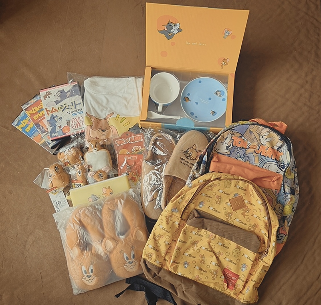トムとジェリーグッズのまとめ売りになり、シャツ、食器、カバン、スリッパ、ペンケース、キーホルダー、ぬいぐるみ(くじ景品)、DVDになります。