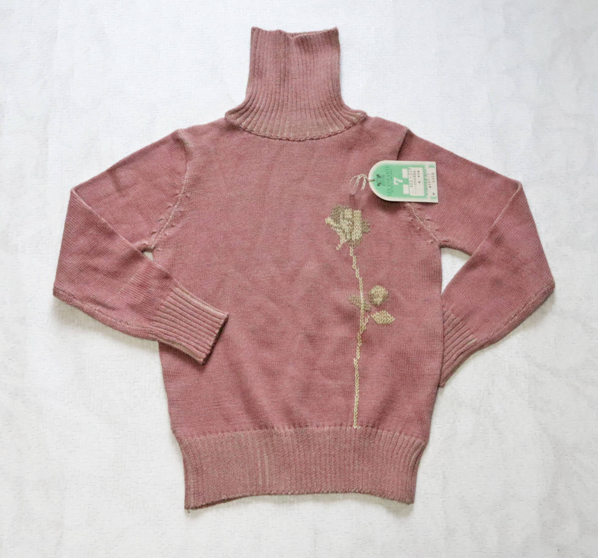 女の子のタートルニット。 淡いピンク。 前身頃の左側のお花のステッチ刺繍がかわいいです。 「7才の表示です。おおよそ120㎝位かと思います。 下記の実寸をご参考下さい。 *サイズ:胸囲68 着丈40 肩幅25 袖丈40 *素材 :アクリル60 ウール40 *メーカー希望小売価格(税抜き):@4000 *備考 :デッドストックです。 落札の際は、その旨ご了承下さい。 | |||