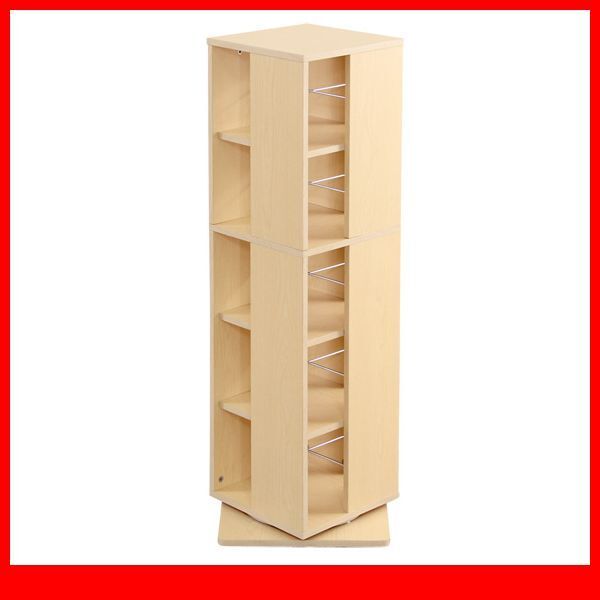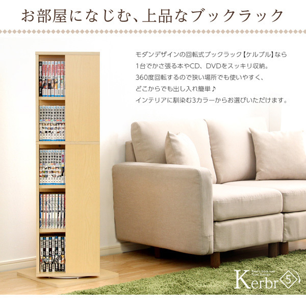 【ポイント】 くるくる回る回転式なので探しやすい! コンパクト設計だから省スペースにおけます。 本やDVDが約200冊収納できる大容量です。 カラーはインテリアに馴染む3色がございます。 |