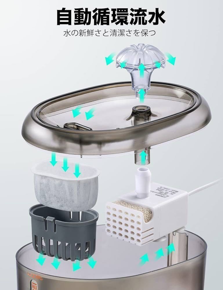 【3重ろ過フィルター】3層の高性能フィルターを採用し、真ん中には、竹炭よりも優れている活性炭やイオン交換樹脂を採用、毛やほこり、臭いなどを除去して水を清潔に保ちます。食事や運動と併せて新鮮な水を定期的に飲むことで、ネコちゃんやワンちゃんの尿路を正常に保ちやすくなります。また、フィルター外部の素材も改良し、耐久性を実現します。※ご注意:ポンプと水タンクは、少なくとも2週間に1回清掃することをお勧めします。