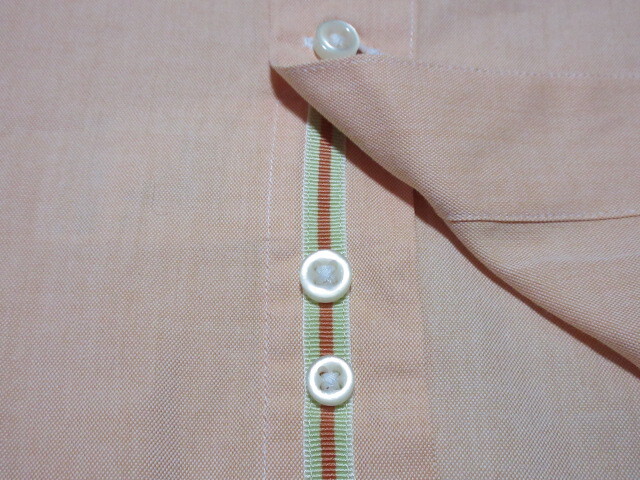 そして、下前立てに付いているテープですが、こちらは左右両サイドがホワイトのライトグリーン地にブラウンに近いオレンジのストライプという色の取り合わせで、第一ボタンを外して着れば見た人に「こいつ、やるな」という印象を与えることができます。