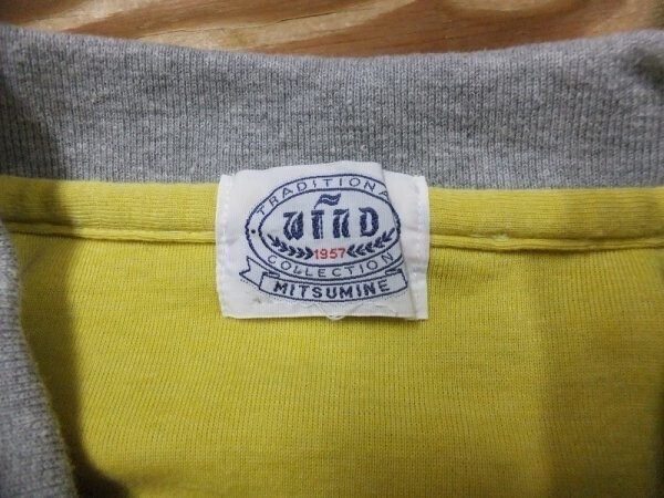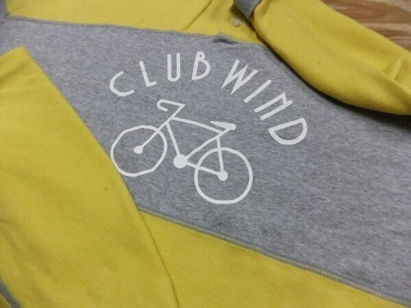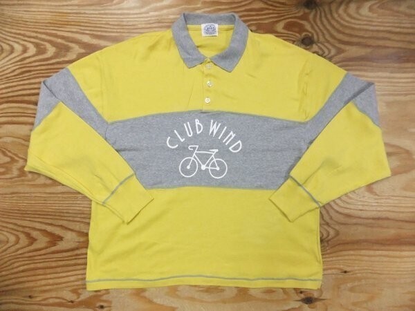 WIND MITSUMINE メンズ オールド レトロ 80s 国産ブランド古着 自転車 サイクルプリント 配色切替 長袖 スウェット ポロシャツ グレー 黄色 です。