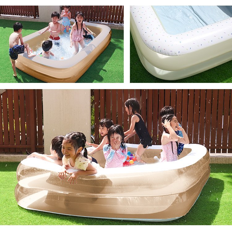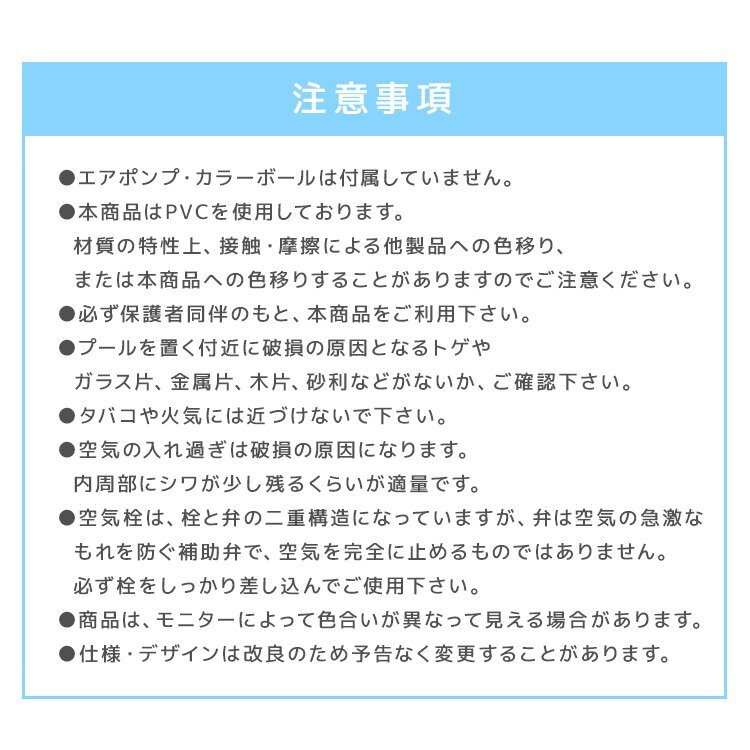\ 暑い夏は、プールで涼しさを味わいませんか♪ / 小さなプールでは物足りない・・・ そんな方にもご満足いただける、約2.8メートルのジャンボファミリープールです。 子どもも大人も家族みんなで楽しめるBIGサイズ! 大人が脚を伸ばしても悠々くつろげるゆったり感! 子どもなら泳げちゃうくらい広々としています。 2気室仕様なので、大人が寄りかかっても倒れず頑丈です! 今年の夏は家族みんなでおうちプールを楽しもう! 【商品コード】PL300CS 【商品詳細】 カラー:カラースプレー サイズ(約):幅280×奥行き170×高さ55cm 重量(約):5.65kg 素材:PVC(ポリ塩化ビニール) 対象年齢:4歳以上 【注意事項】 ・エアポンプは付属していません。 ・本商品はPVCを使用しております。材質の特性上、接触・摩擦による他製品への色移りまたは本商品への色移りすることがありますのでご注意ください。 ・必ず保護者同伴のもと、本商品をご利用下さい。 ・本品は水深が深くなるため、対象年齢未満のお子様は使用しないで下さい。 ・プールを置く付近に破損の原因となるトゲやガラス片、金属片、木片、砂利などがないか、ご確認下さい。 ・タバコや火気には近づけないで下さい。 ・空気の入れ過ぎは破損の原因になります。内周部にシワが少し残るくらいが適量です。 ・空気栓は栓と弁の二重構造になっていますが、弁は空気の急激なもれを防ぐ補助弁で、空気を完全に止めるものではありません。 必ず栓をしっかり差し込んでご使用下さい。 ・プールは安定した平らな場所でご使用下さい。傾斜のある場所、タイル・煉瓦など目地や段差のある場所でのご使用は変形・破損の原因になりますので避けて下さい。 また、表面に塗装・コーティング等の処理された場所でのご使用は塗装等が変色したりプール本体に色移りすることがあります。ご注意下さい。 ・商品は、モニターによって色合いが異なって見える場合があります。 ・仕様・デザインは改良のため予告なく変更することがあります。 【もちろん新品未使用品です】 |