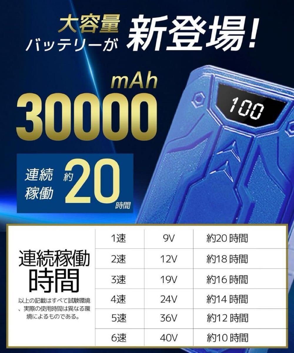 【30000mAh大容量バッテリー最大20時間連続使用の超耐久設計】本社は最新の成果を採用し大容30000mAh/111WHモバイルバッテリー搭載で 日本電気安全法認証(PSE)取得の高品質リチウムポリマー電池を採用専用急速ACアダプターは約短い時間でバッテリーを100%にすることができます。驚くほどの爆風が、より長時間維持できます。9V-12V-19V-24V-36V-40Vの6段階風量切り替え可能。夏季の広域野外作業における疲労軽減・作業効率向上・熱中症予防に効果的。2025年夏の必須アイテム。※以上のデータは室温25℃の環境下で試験され、バッテリー