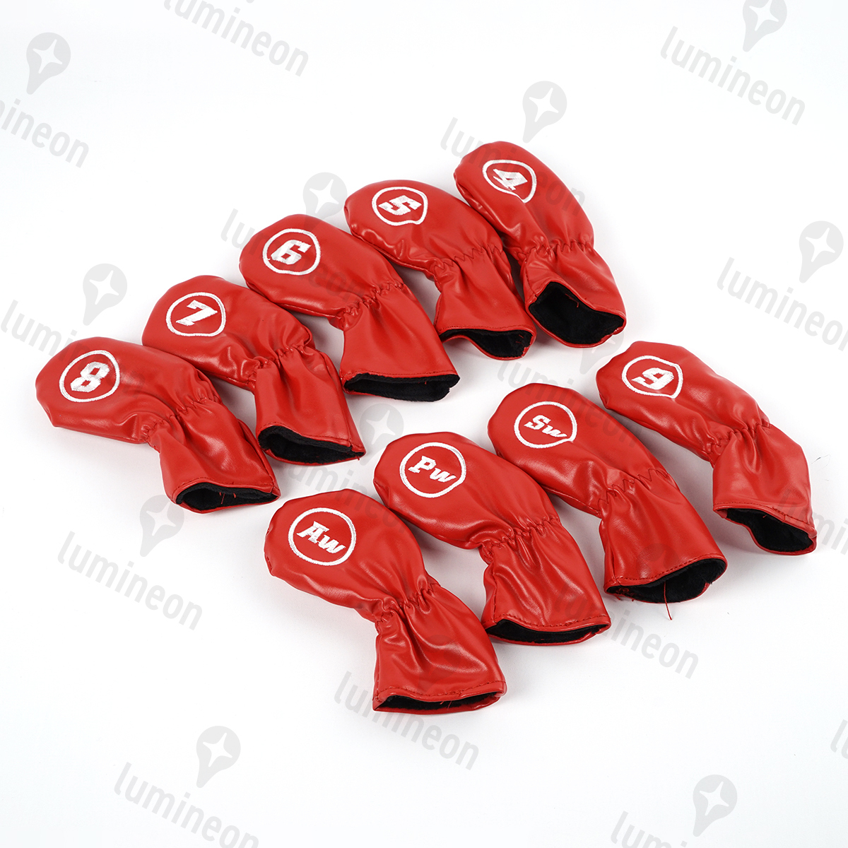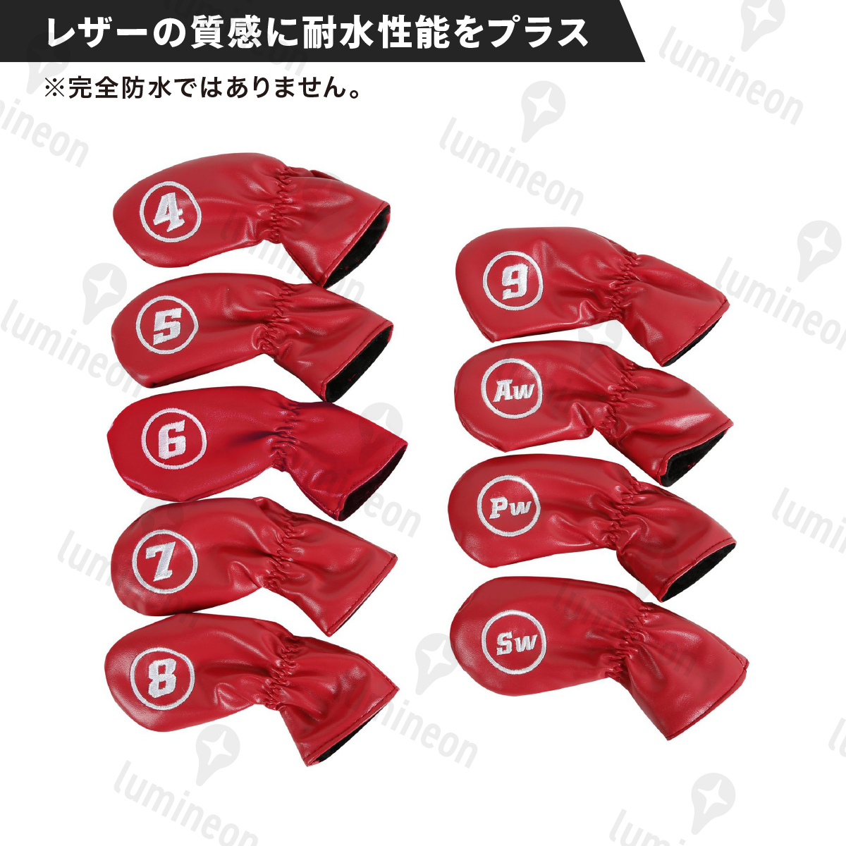 アイアン カバー ヘッド 9点 セット ゴルフ クラブ レッド 赤 高級 レザー 裏ボア 刺繍入り 撥水 耐水 フード 番手付き シンプル g082c 3
