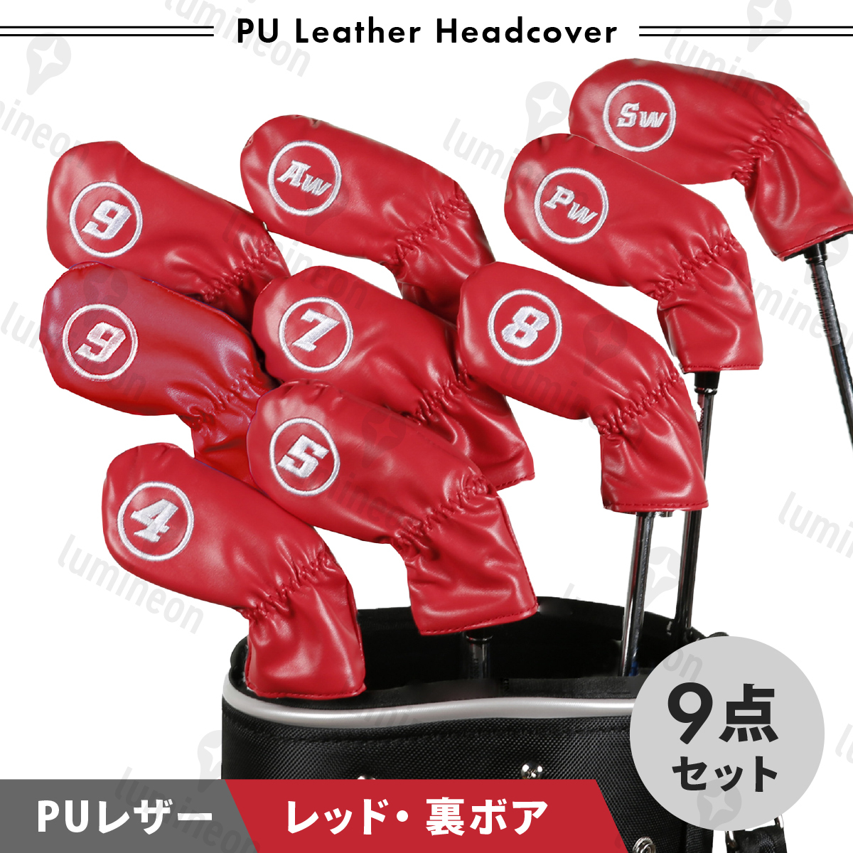 アイアン カバー ヘッド 9点 セット ゴルフ クラブ レッド 赤 高級 レザー 裏ボア 刺繍入り 撥水 耐水 フード 番手付き シンプル g082c