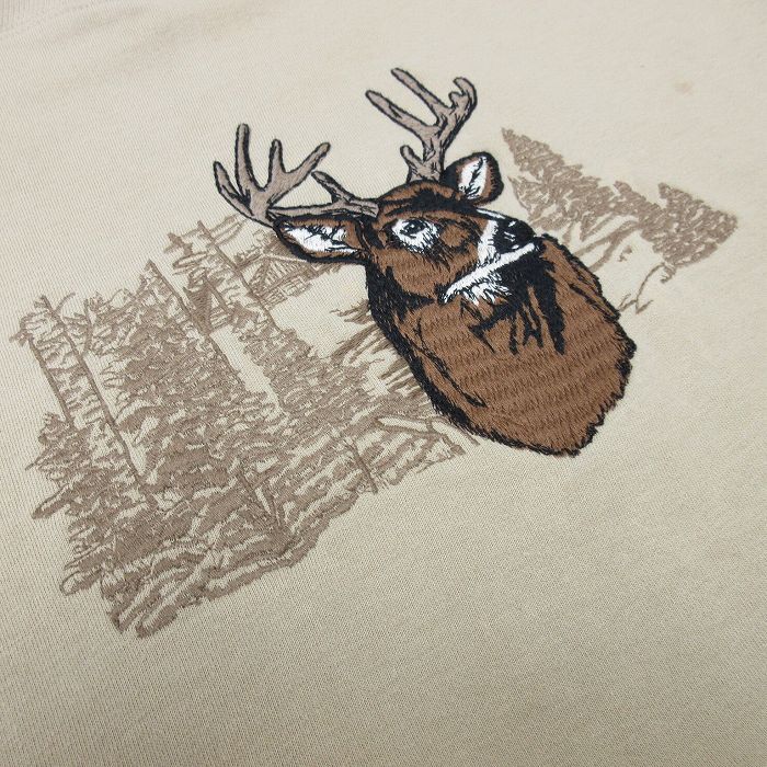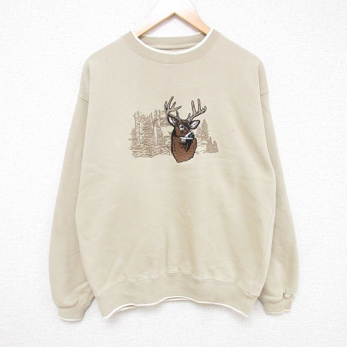 【商品名】 L★古着 長袖 スウェット メンズ 00年代 00s シカ 刺繍 クルーネック ベージュ