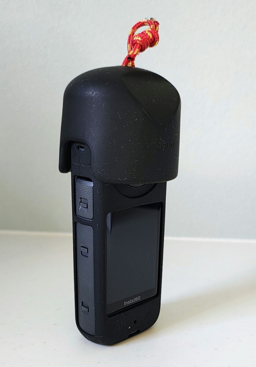 サードパーティ製ですがシリコンジャケットとレンズカバー(3枚目、4枚目の写真。リーシュをつけるための加工をしています)をつけます。純正のものと比較して、つけ外し時にレンズに擦らないため使いやすいです。