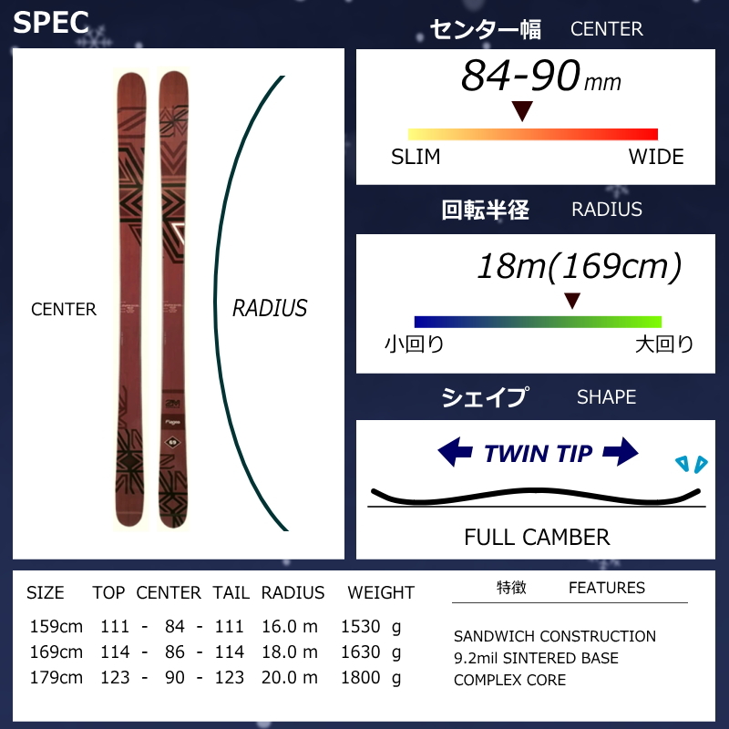 エッジグリップに優れるフルキャンバーのベンドと様々なコンディションでキレの良い滑りができる80mm台のセンター幅で、ゲレンデ中でカービングターンを楽しめるフリースキー。コブでも細かい動きにも対応し。ポップ間の強いキャンバーは地形でのちょっとしたジャンプや遊びもダイナミックに!!ゲレンデの滑り心地は捨てず、パークやパイプも楽しみたい人におすすめのスタンダードなツインチップスキーです。19-20の少し古い型落ちモデルですが、しっかりとした構造と滑走性の高いシンタードベースを使用しており大変コスパの良い板になっております。
