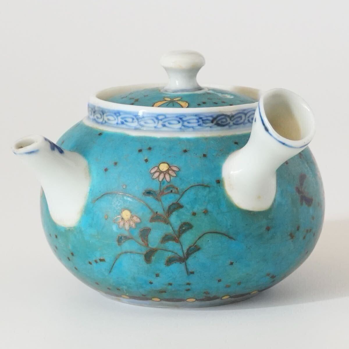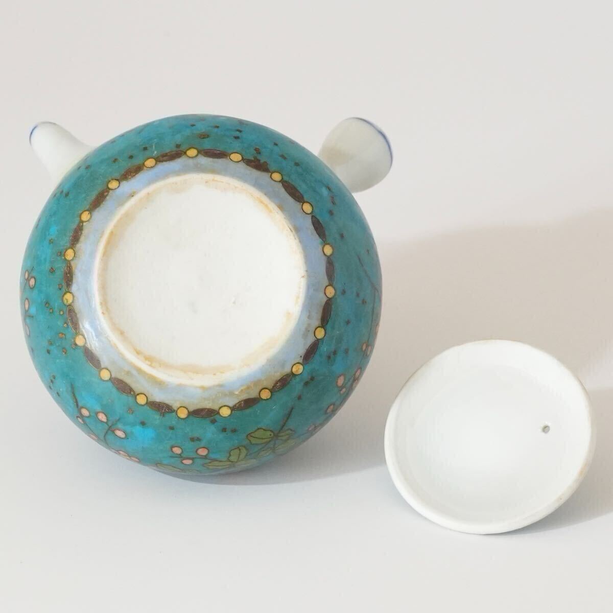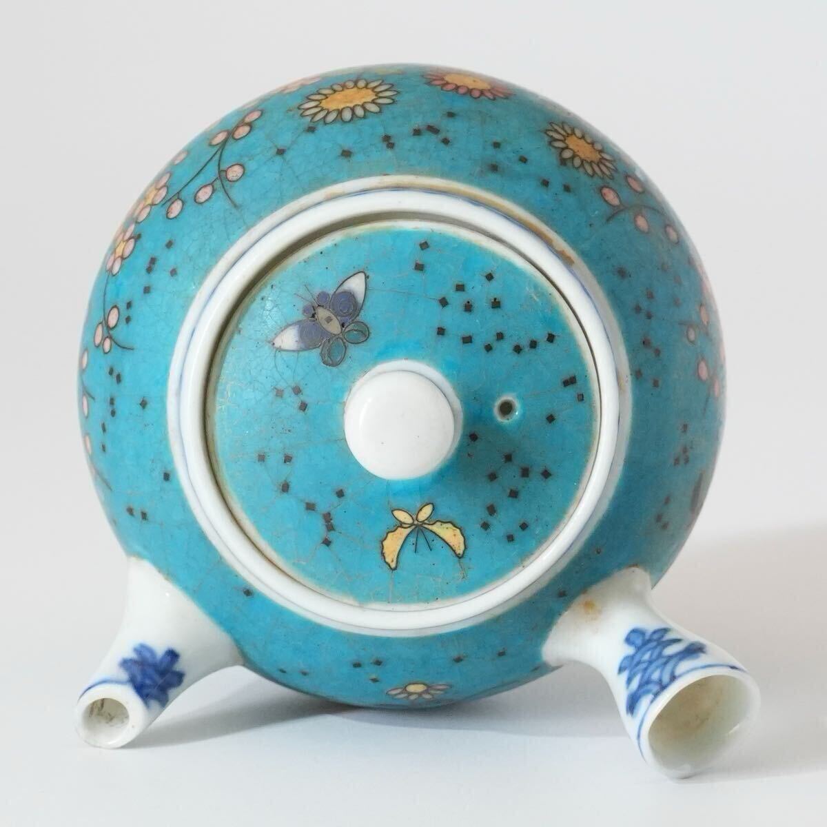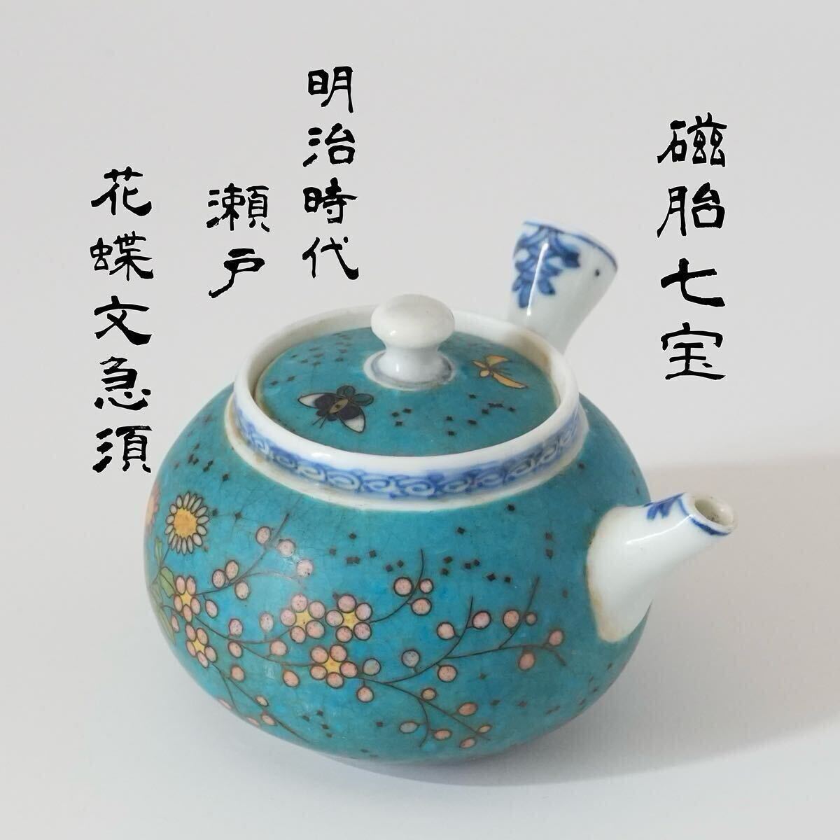 明治時代 磁胎七宝 染付 花蝶文 急須 # 時代 瀬戸 明治工芸 竹内忠兵衛 七宝會社 幹山 ポット 茶器 茶道具 骨董 古美術 開洋社 尾張七宝