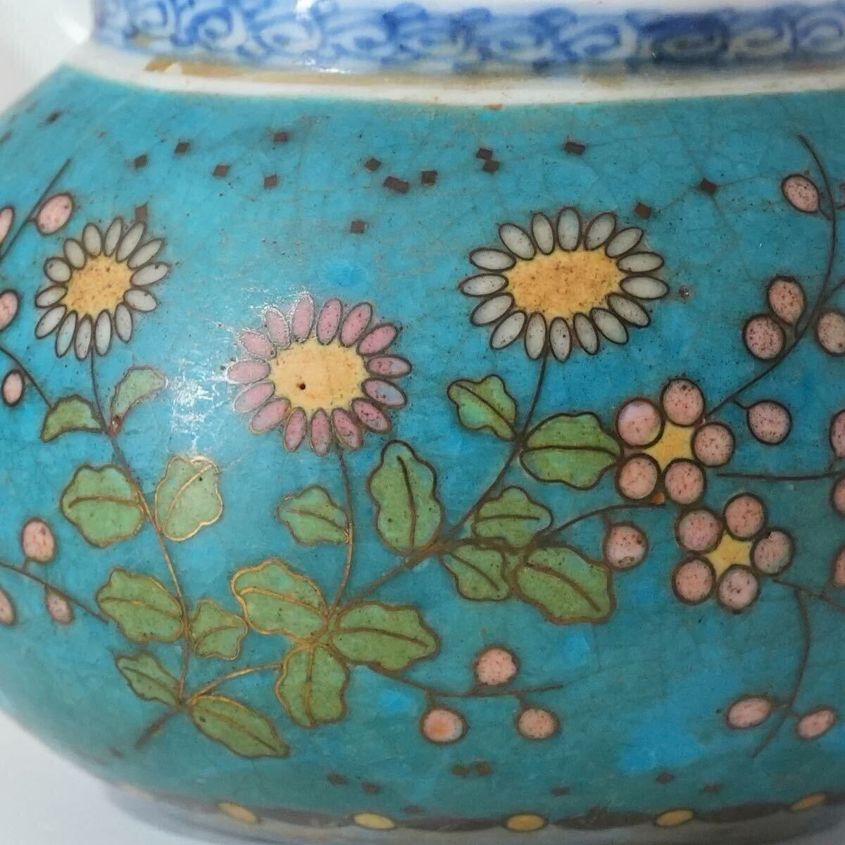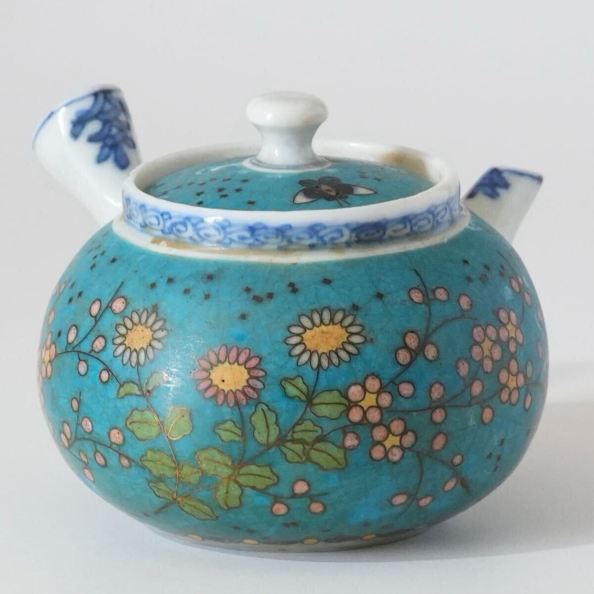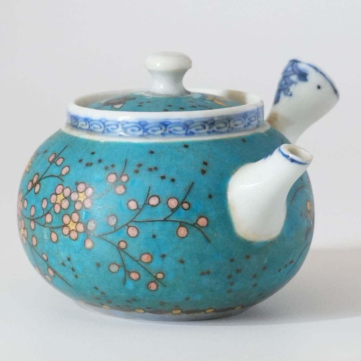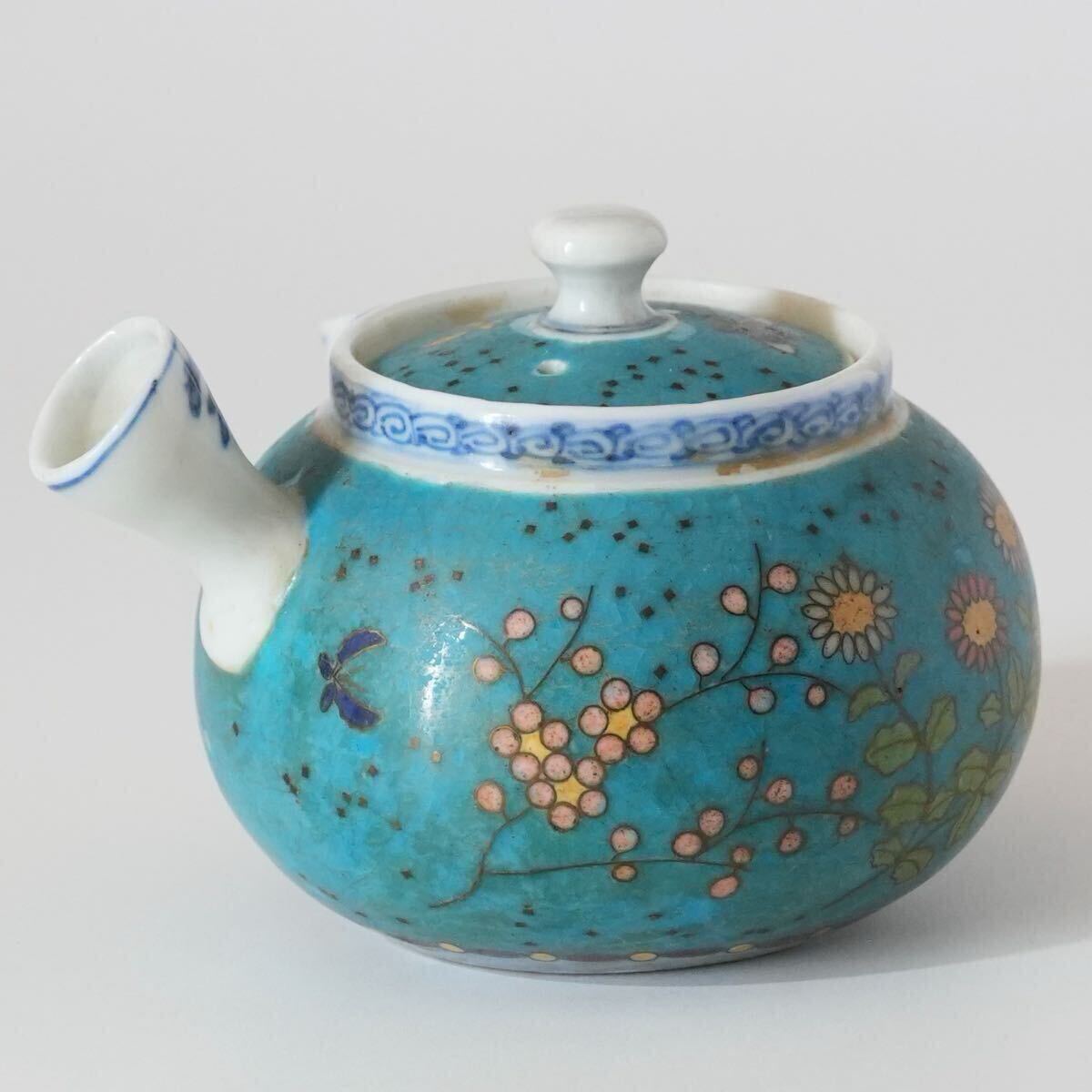 明治時代 磁胎七宝 染付 花蝶文 急須 # 時代 瀬戸 明治工芸 竹内忠兵衛 七宝會社 幹山 ポット 茶器 茶道具 骨董 古美術 開洋社 尾張七宝