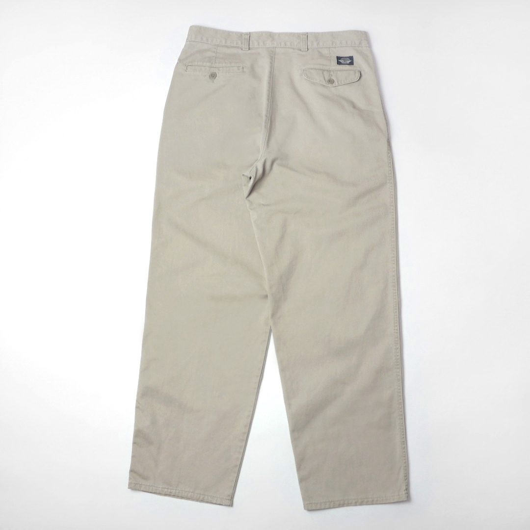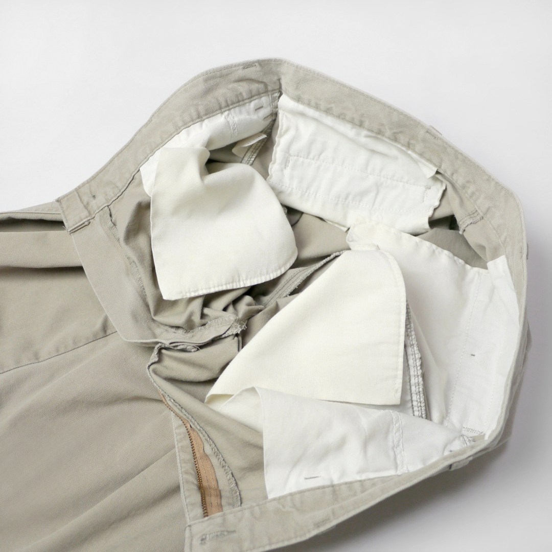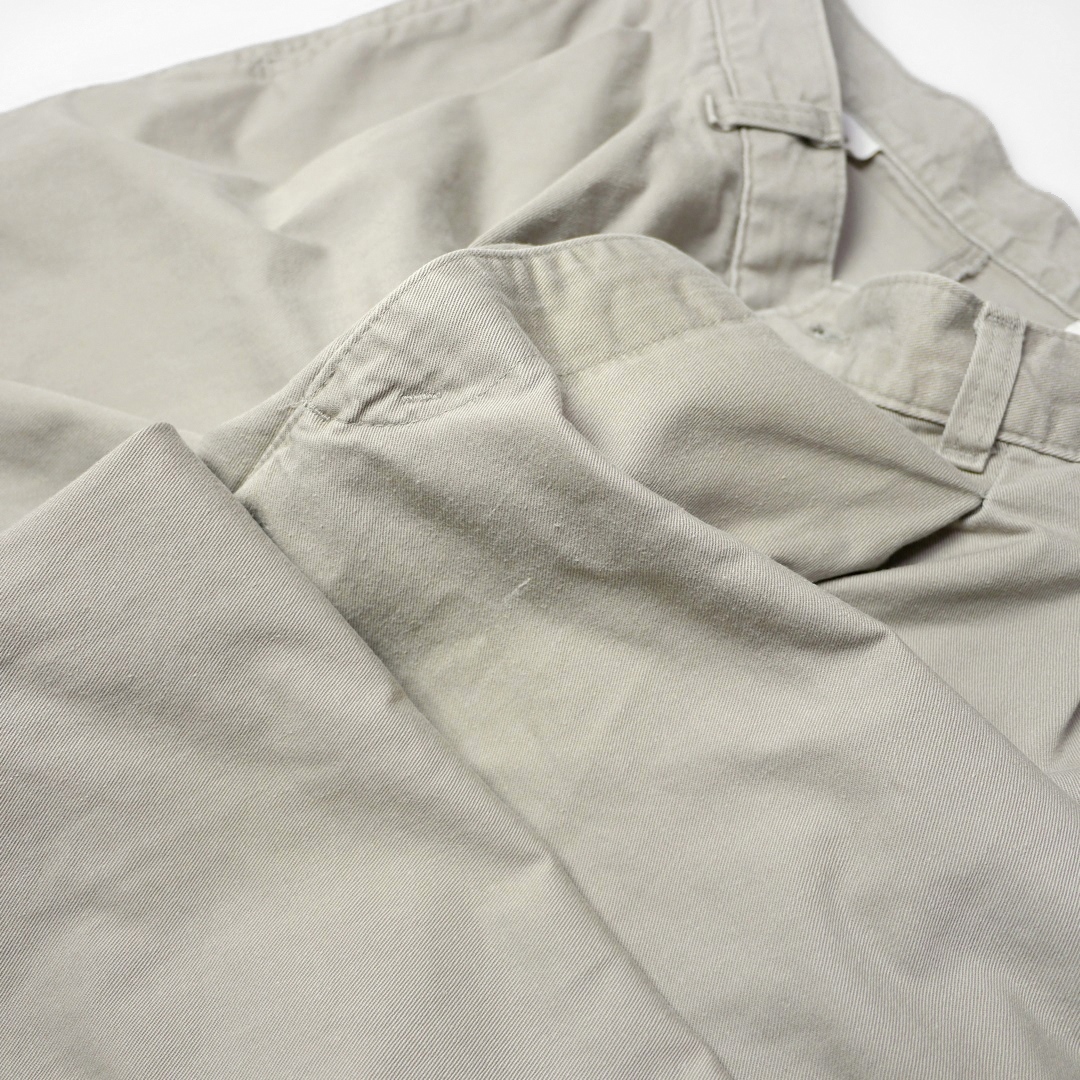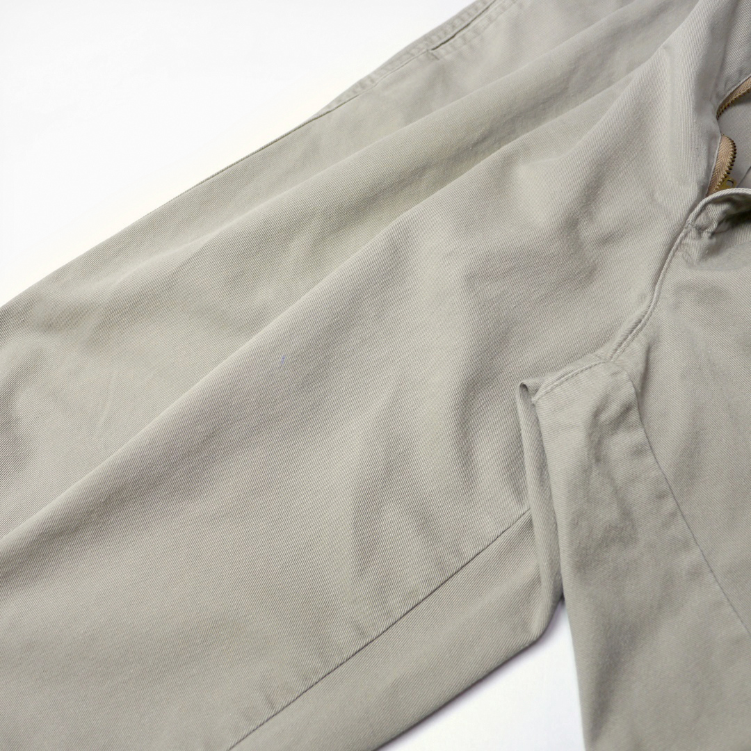■ブランド 80s-90s、LEVIS、DOCKERS、MADE IN USA ■素材 100%COTTON ■カラー ベージュ/ライトベージュ、グレージュ系 色味の表現が難しいのですがくすんだ感じの色味になります。 ジッパーテープがカーキブラウン系なので薄茶色が混じった感じだと思います。 ■詳細 アメリカで購入したリーバイス/ドッカーズのコットンツイルパンツです。 80年代-90年代(1991年製)、旧タグのアメリカ製で生地はシッカリとしたオールコットンになります。 シルエットはほどよくユッタリとしたツータック入りのテーパードです。 イイ感じに雰囲気よく経年変化しております。 ■状態 コットン特有の色落ち、フェード、アタリ、多少の毛羽立ち、薄めのセンターシームあと、モモにミリ単位のペンあと、モモ後ろに小さな薄染み数点、左前など製織時に生じたミリ単位の織傷あり。 着用に問題あるダメージはなく良好です。 ■サイズ 表記 W33 L30 (実寸W33 L29 *下記参考下さい) ウェスト 42cm×2 股下 74cm 総丈 102cm 裾幅 21cm 股上前 30cm 股上後 42cm ワタリ 35cm ヒップ 52cm-56cm ■注意事項 状態は細かく確認しておりますが、傷や汚れの見落とし、実寸誤差、色味差異など生じる場合がございます。 不明な点がありましたら入札前にご質問下さい。 商品にあわせて洗濯やクリーニングメンテナンスを施しておりますが、ビンテージやアンティークなど中古品になりますので特性のご理解をお願いします。 |